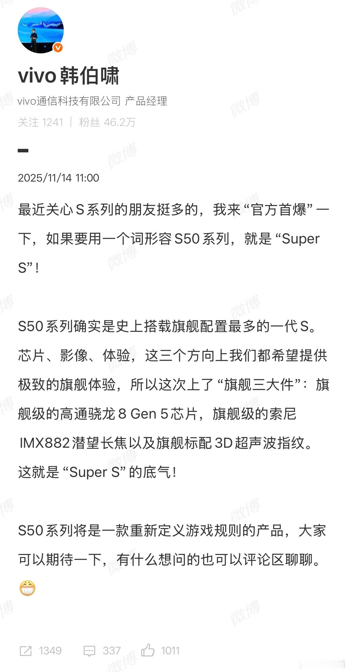 vivo S50系列代号战斗天使:骁龙8 Gen 5、满血LPPDDR5X+UFS4.1、3D超声波指纹、潜望长焦......本月发布,这是要越级啊!OPPO Reno15系列,11.17荣耀500系列,11.24华为Mate80系列,11.25一加Ace6T,本月