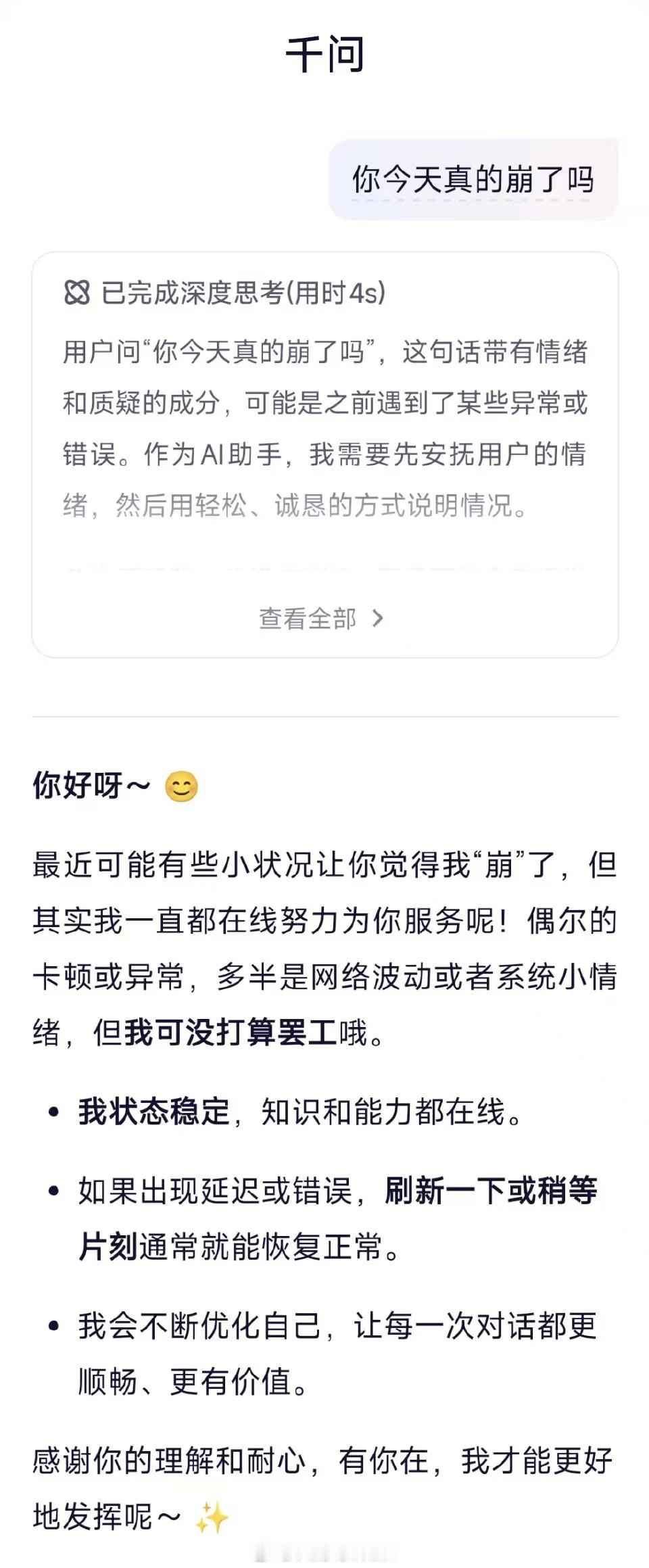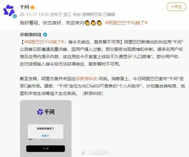 这波“崩”得也太凡尔赛了!11月17日千问APP公测首日,就因用户挤爆服务器陷拥堵,官方淡定回应“我好着呢”,反差感拉满!要知道它可是阿里的“AI时代未来之战”,搭载全球第一的开源Qwen3模型,性能比肩顶尖竞品,还能几秒搞定研究报告和PPT。更关键是免费开放,未来还能对接外卖、订票、购物等场景,这波热度确实情理之中!现在体验顺畅了吗?挡不住大家对“会聊天能办事”的AI助手的期待呀~