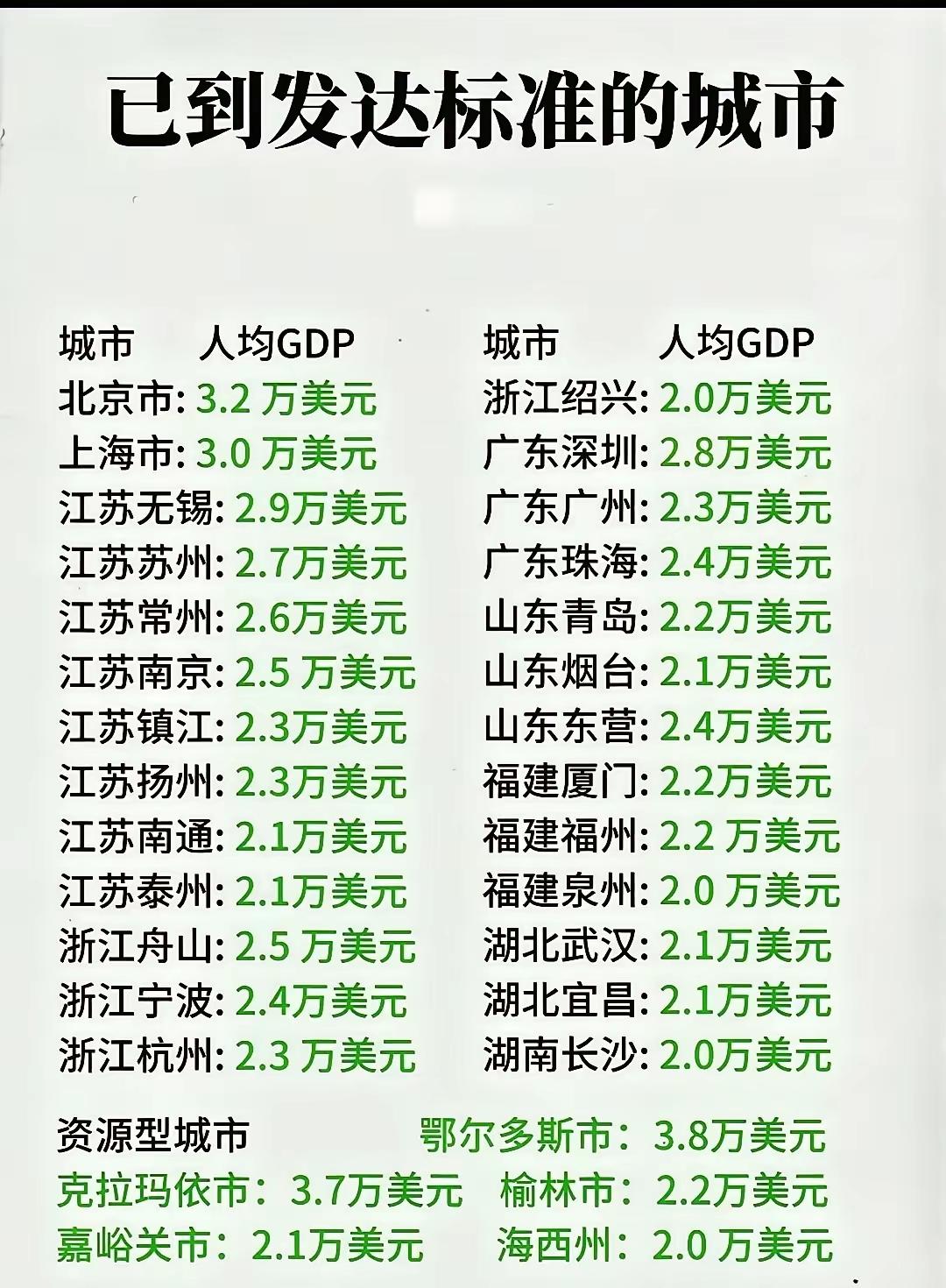 全国已到发达标准的城市,深圳和广州排名靠前! 对全国城市的人均 GDP 做一个统计,其中主要城市的数据太惊人,北京和上海作为超级城市,人口多,经济总量大,人均 GDP 也很高。 广东省来看,深圳和广州的人均 GDP 都已经超过了 2 万美元,深圳达到了 2.8 万美元,广州达到了 2.3 万美元,在主要大城市中位列较靠前位置。 其实珠海数据应该也不错的,没有被统计进来,有点可惜。 广东其他城市的人均 GDP 就不算太高。 全国还有个别资源型城市,人口少,但 GDP 总量很高,人均值超高,譬如鄂尔多斯、克拉玛依等城市。 对此大家怎么看?欢迎评论区留言讨论!