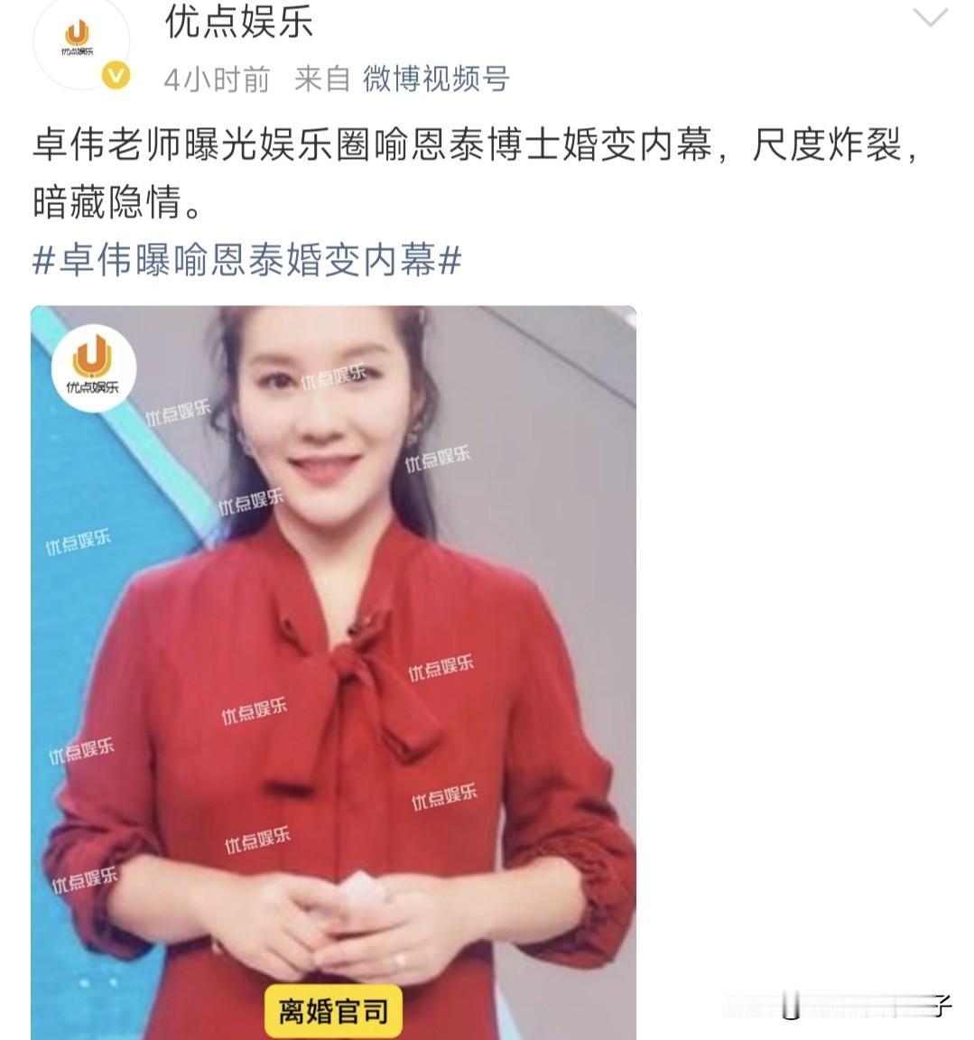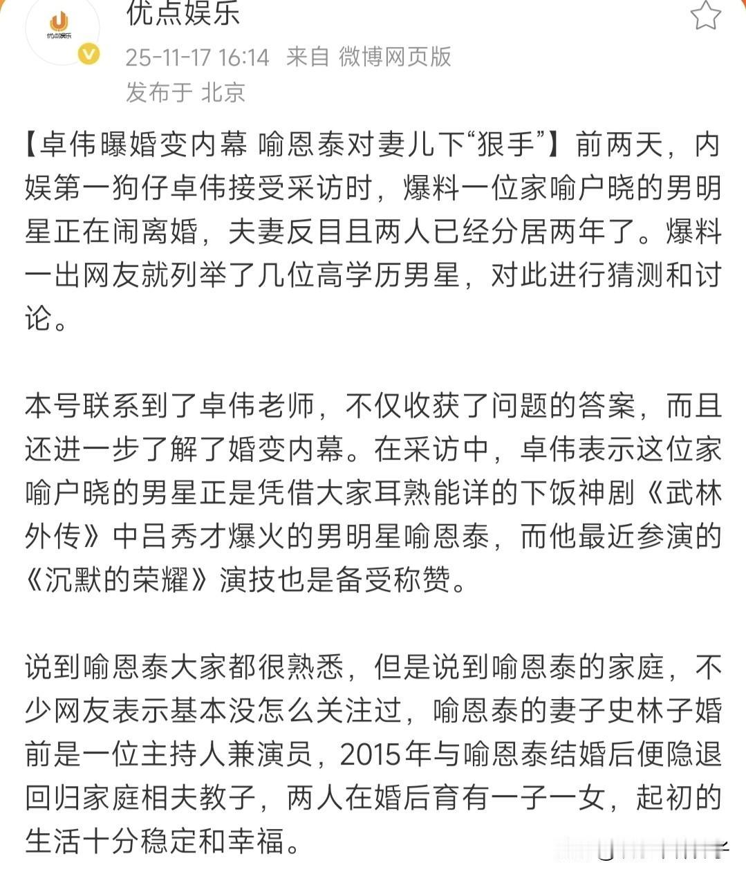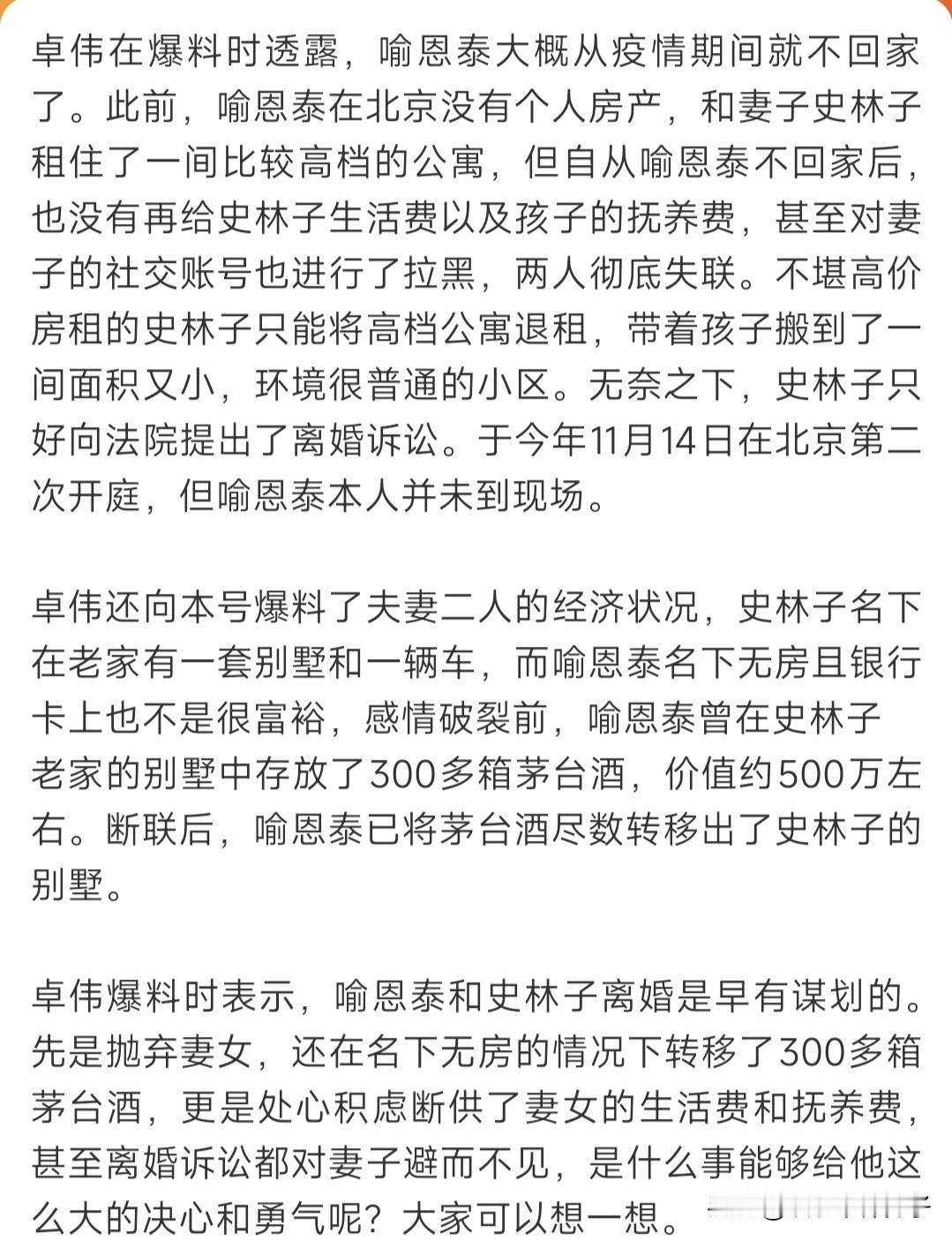 卓伟曝喻恩泰离婚内幕,尺度炸裂,暗藏隐情……,以上是娱记用的标题! 说实话,这架势跟台媒或者港媒的套路有的一拼,确实挺吸引人,出于好奇,简单看了一下爆料内容。 卓伟爆料称:喻恩泰不回家,也不给妻子生活费以及孩子的抚养费,两人彻底失联,史林子无奈向法院提出离婚诉讼。 还提到男方抛弃妻子,转移了300多箱的茅台,一切早有预谋,并且最后还给大家留下一个悬念。 首先,至于爆料是真是假?不得而知,只看内容,不敢妄自评论,毕竟,家家有本难念的经,详情咱也不了解。 网上资料显示,喻恩泰和妻子婚后育有一儿一女,史林子也是演员,毕业于名校,非常漂亮,也算门当户对了。 翻看几年前,史林子为喻恩泰庆生的博文,甜蜜表白,对老公赞不绝口,完全看不出感情破裂的迹象。 咱就说,妻子不仅漂亮,又温柔体贴,而且儿女双全,幸福的一家四口,这都能闹到法庭,有点难以理解。 有一点好奇,卓伟为啥知道这些内情?除了当事人自曝,想不出别的答案。 还是那句话,网上爆料未必可信,希望大家理性吃瓜。