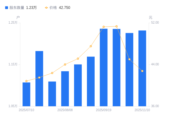 日期A股户数(户)流通A股户均持股数(股)户均持股市值(万元)2025-11-10123153529.3515.092025-10-10122533547.2115.962025-09-30123523518.7818.052025-09-19123563517.6418.022025-08-29116873719.0017.672025-08-20115013779.1417.052025-08-08113383833.4716.872025-07-31110923918.4916.602025-07-18118213676.8415.262025-07-10110693926.6316.03