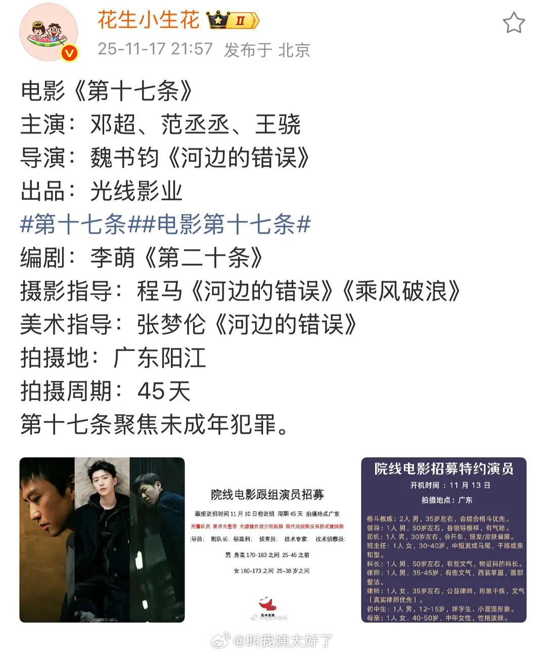 《第十七条》主演是邓超、范丞丞、王骁,范丞丞资源还是挺好的。