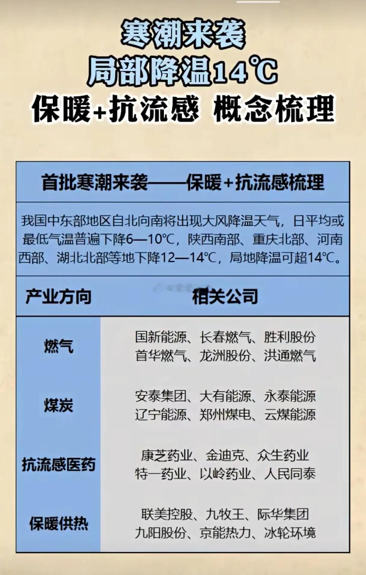 《降温14℃+流感暴击!谁在寒潮里赚翻了?》当陕西南部、重庆北部等地气温“断崖式”暴跌14℃,当北方流感病例占比反超南方、医院门诊量激增25%,一场“保暖+抗流感”的民生刚需,正变成产业的“掘金窗口”。你裹紧羽绒服时,燃气板块已批量涨停:长春燃气开盘1分钟封板,胜利股份靠收购燃气公司连拉四板,而国新能源等区域供气龙头,正顶着15%的需求增幅保供;你抢购奥司他韦时,东阳光7×24小时满负荷生产,以岭药业的连花清瘟因91.3%的甲流抑制率被家庭疯抢;就连你家的电热毯,都让彩虹集团的销量周涨200%。更关键的是,这场寒潮撞上了“能源保供+流感高峰”的双重刚需:煤炭坑口价重回800元/吨,京能热力因供暖提前增收5%-8%,而抗寒小麦种子、除雪设备的订单,也在低温里悄悄翻倍——原来你冷得跺脚时,早有产业把“寒意”变成了真金白银。