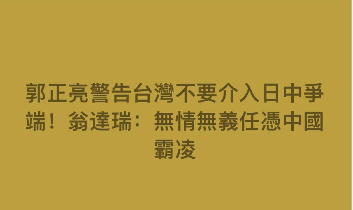 郭正亮警告台湾不要介入中日争端! 翁达瑞不满称,无情无义任凭对岸霸凌。 美国和日本可以欺负台湾,但大陆不许!