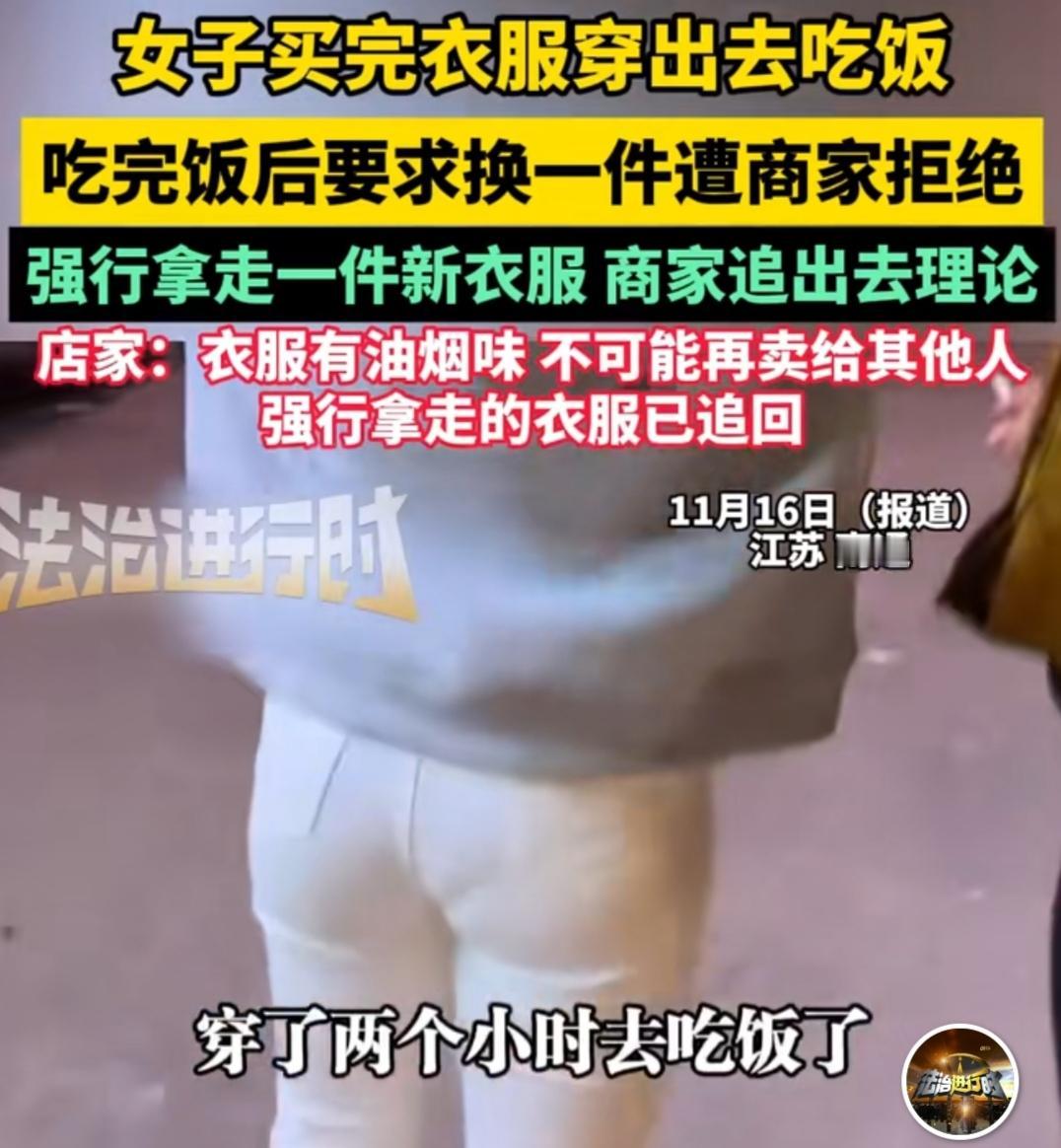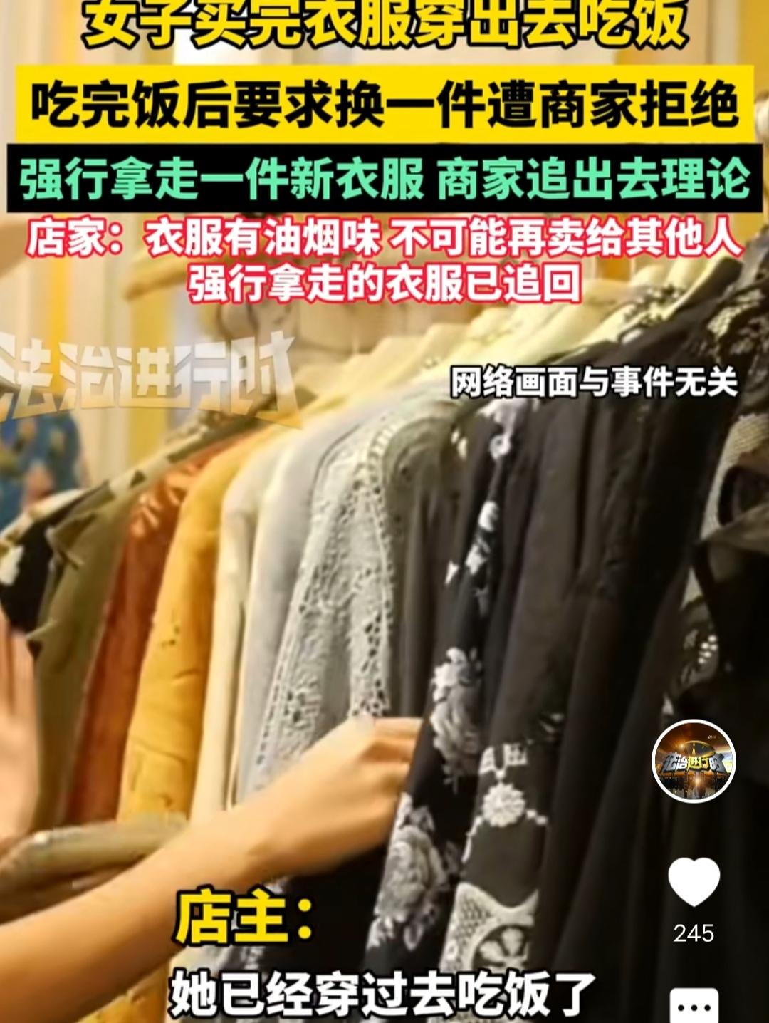 女子买衣服穿着去吃饭,饭后要换货,还强行拿走一件新的。 刚看到一个相关媒体平台发布的消息,江苏南通的一个女的,到线下店买衣服,然后直接穿着衣服跟一帮人去吃饭了,结果吃完饭后她跑来换货,说什么给20块钱,商家老板肯定拒绝啊,这是线下实体店,你买之前是自己试过看得清清楚楚的,而且衣服上也有油烟味,烟酒味了,吊牌也剪了,这让人老板怎么换?这衣服还能卖给谁? 遭到老板拒绝的女子,强行拿走一件新的,老板追出来理论,好在后面追回来了。 真的是搞不明白这女的想的什么,一点常识都没有吗?以为全世界都该围着她转吗?你要说你没有穿,没有粘上什么味,包装也没有拆,吊牌也没有剪,就想换个颜色,老板应该也不会拒绝,因为这毕竟不会影响老板二次销售,但你穿去吃饭,搞成这样,谁会买一件别人穿过,还有味儿的衣服,你会吗?所以换位思考一下就该懂得彼此理解了。