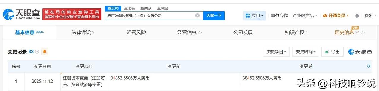 【赛百味上海餐饮管理公司增资至3.8亿 增幅约21%】 天眼查工商信息显示,近日,赛百味餐饮管理(上海)有限公司发生工商变更,注册资本由约3.2亿人民币增至约3.8亿人民币,增幅约21%。 赛百味餐饮管理(上海)有限公司成立于2014年4月,法定代表人为朱付强,经营范围包括餐饮管理、工艺美术品及礼仪用品销售、玩具销售等。股东信息显示,该公司由上海富瑞食企业发展有限公司全资持股。 天眼查信息: