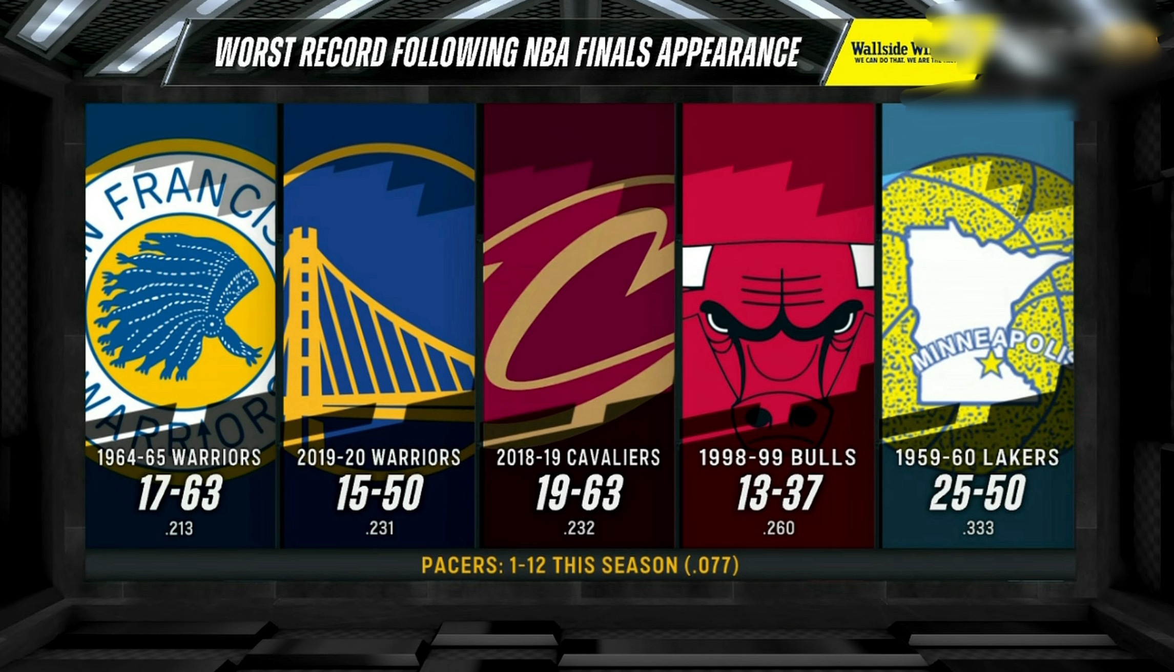 上赛季在NBA总决赛中失利后,取得第二名球队在接下去后的一个赛季最差战绩排名!
