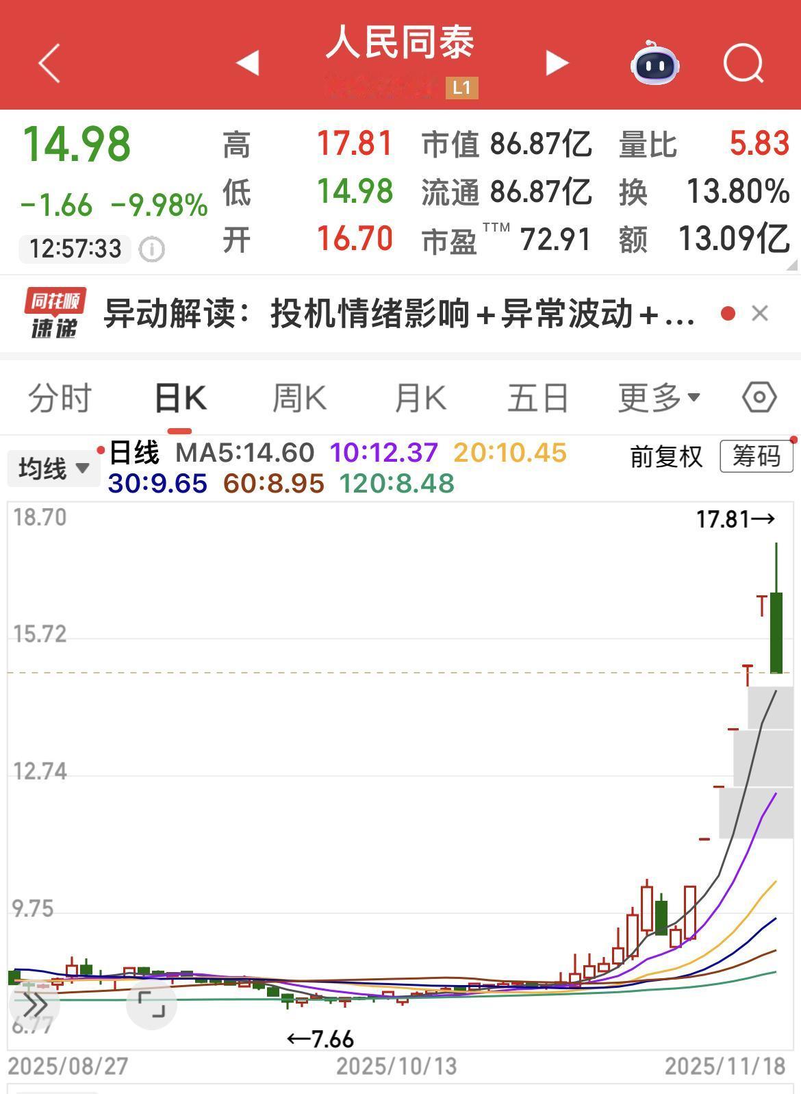 人民同泰6个涨停之后,跌停了! 主要受“平潭发展、海峡创新、合富中国停牌”影响!