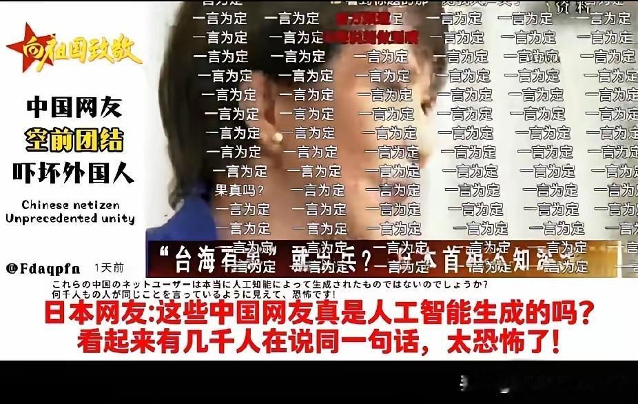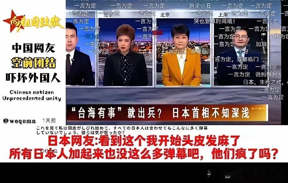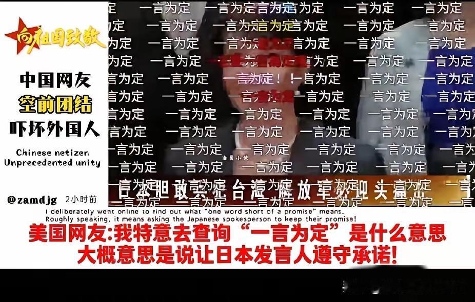 想不到,“一言为定”的弹屏火了,而且本该属于中国人的顶级浪漫这次竟然是说给一个外国人听,高市早苗在中国创造了“历史”,她的涉台言论让我们看不清她的脸庞,只能恍恍惚惚看到有一个人头,这样密集而又统一的弹幕,我们只看到过3次。 ​1.毛主席喊“人民万岁”,满屏的弹幕都是“人民万岁”。 ​2.诸葛亮病逝五丈原,满屏都是“丞相保重”。 ​3.高市早苗扬言武力介入台海,以为此言一出会让中国人惧怕,结果她想不到中国人满屏都是“一言为定”,一言为定,就是希望她说到做到,不许反悔。 看到满屏的一言为定,美国网友也很好奇,想知道中国网友想表达什么 ,他忍不住去查了“一言为定”是什么意思,结果发现中国人的意思就是让日本发言人“遵守承诺”。 他估计还理解不够,我给他解释一下,一言为定,意思就是言出如山,意思就是言出既遂,意思就是君子一言驷马难追,意思就是言必信行必果,意思就是一诺千金。意思就是你高市早苗不要玩嘴,你敢出海看我们中国怎么新仇旧仇一起报。 对于高市早苗的不当言论,日本人比中国人更狠,中国人要求高市早苗收回错误言论,日本直接要求高市早苗下台。 14日,日本民众在东京首相官邸前集会抗议她的错误言论,不仅要求她收回发言、赶快道歉,而且要求她下台,他们高喊:不会外交的人,不适合当首相。 看到满屏的“一言为定”,日本网友说:“这些中国网友是人工智能生成的吗?看起来几千人说同一句话,太恐怖了!” 对的,中国人就是这样,顶级浪漫给到你,压迫感给到你,作为国家新上任的首相,你想都不想就说要出兵台海,还说“台湾有事”,就是“日本有事”,我们中国的内政问题你来指手画脚,对特朗普却极尽谄媚,我们不与你多说 ,只是满屏的“一言为定”,表明我们不怕你的言论,你敢说就得承担后果,“一言为定,驷马难追,后果自负!”你高市早苗细品,慢慢品!