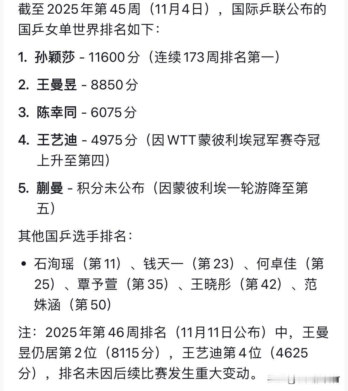 王曼昱带领黑龙江女队晋级四强 全运会乒乓球女团1/4决赛 黑龙江队3:2江苏队晋级四强 第一场女双 钱天一石洵瑶3:0战胜张瑞范姝涵 第二场女单 蒯曼0:4王曼昱 王曼昱世界排名第二, 蒯曼世界排名第四 蒯曼可不弱。王曼昱零封蒯曼,王曼昱真强[赞][赞]大比分1:1。 第三局女单 石洵瑶1:3范姝涵 这场球是关键。范姝涵打的真好。范姝涵立功了。 石洵瑶世界排名第11,范姝涵世界排名50。石洵瑶对阵范姝涵,石洵瑶妥妥上风球。石洵瑶却输给了范姝涵。范姝涵打的真棒👍。 第四场女单 蒯曼3:0张瑞 第五场女单 钱天一0:3王曼昱 钱天一世界排名23。 王曼昱零封蒯曼,零封钱天一,王曼昱真强。黑龙江女队一定在全运会期间多和王曼昱一起练习,多多提高自己。 恭喜黑龙江女队晋级四强 半决赛 半决赛黑龙江队对阵河北队 王曼昱再次对阵孙颖莎