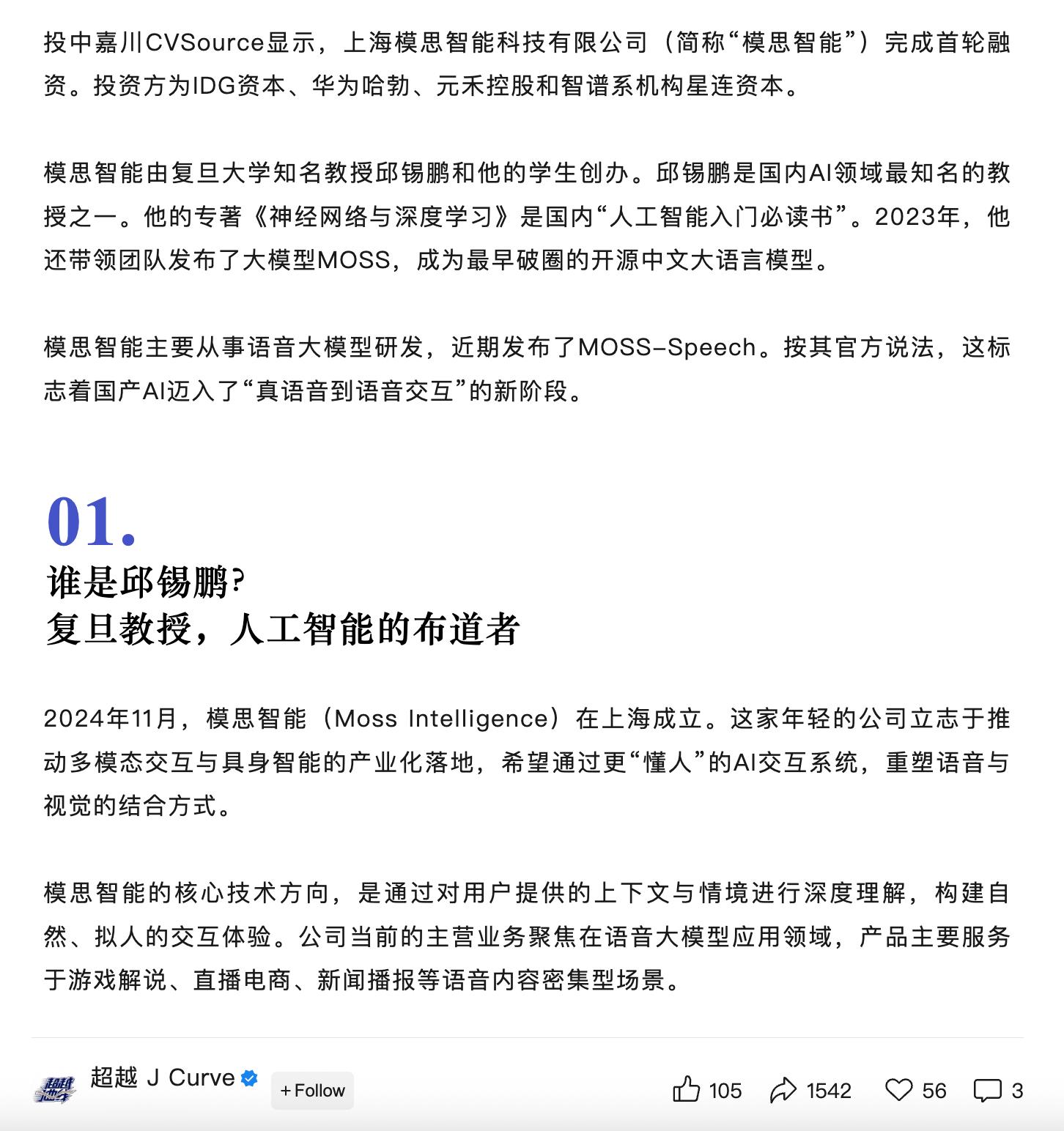 昨天查资料的时候才发现邱锡鹏老师带着他的 Moss 和学生们创业了。