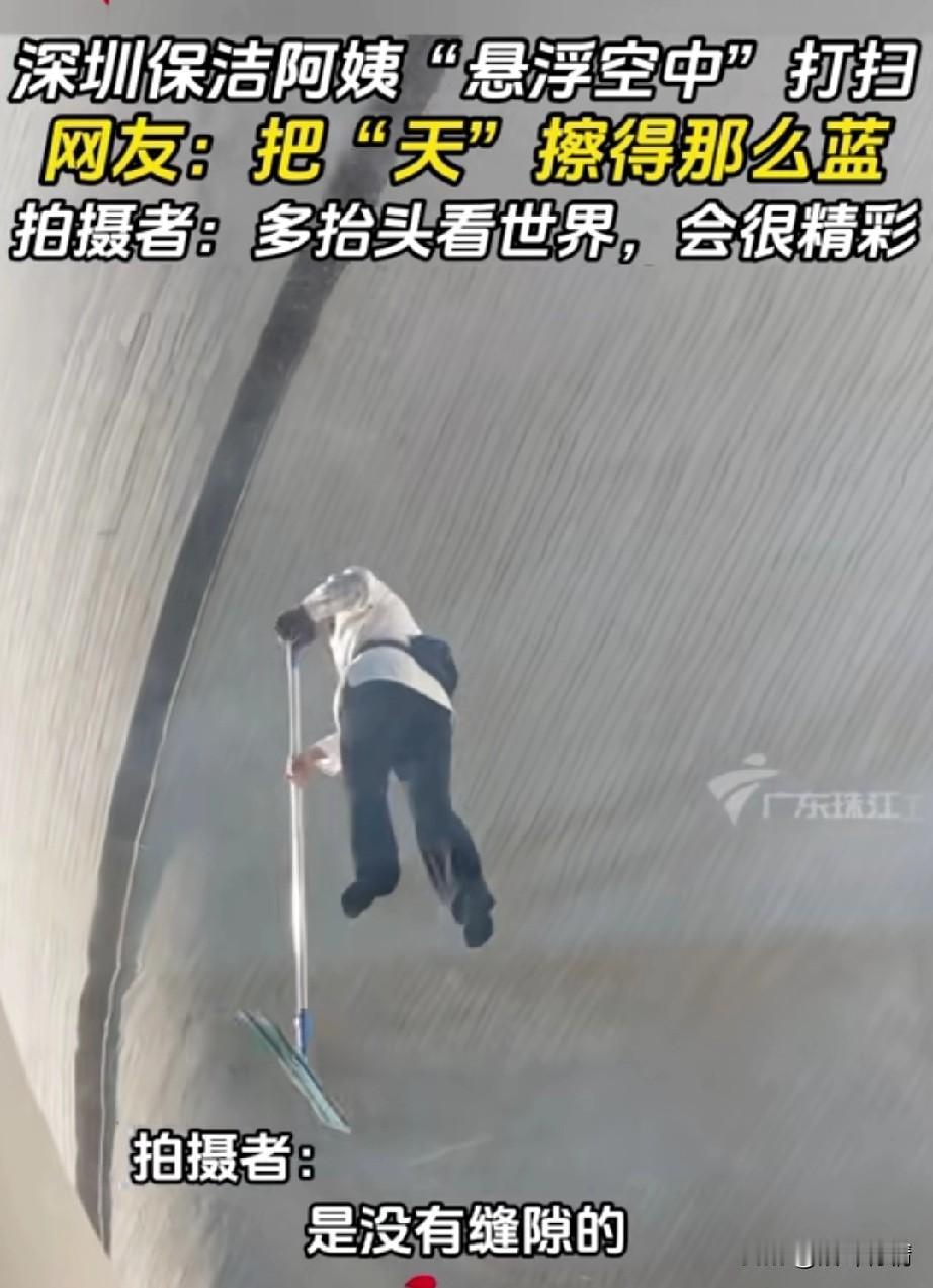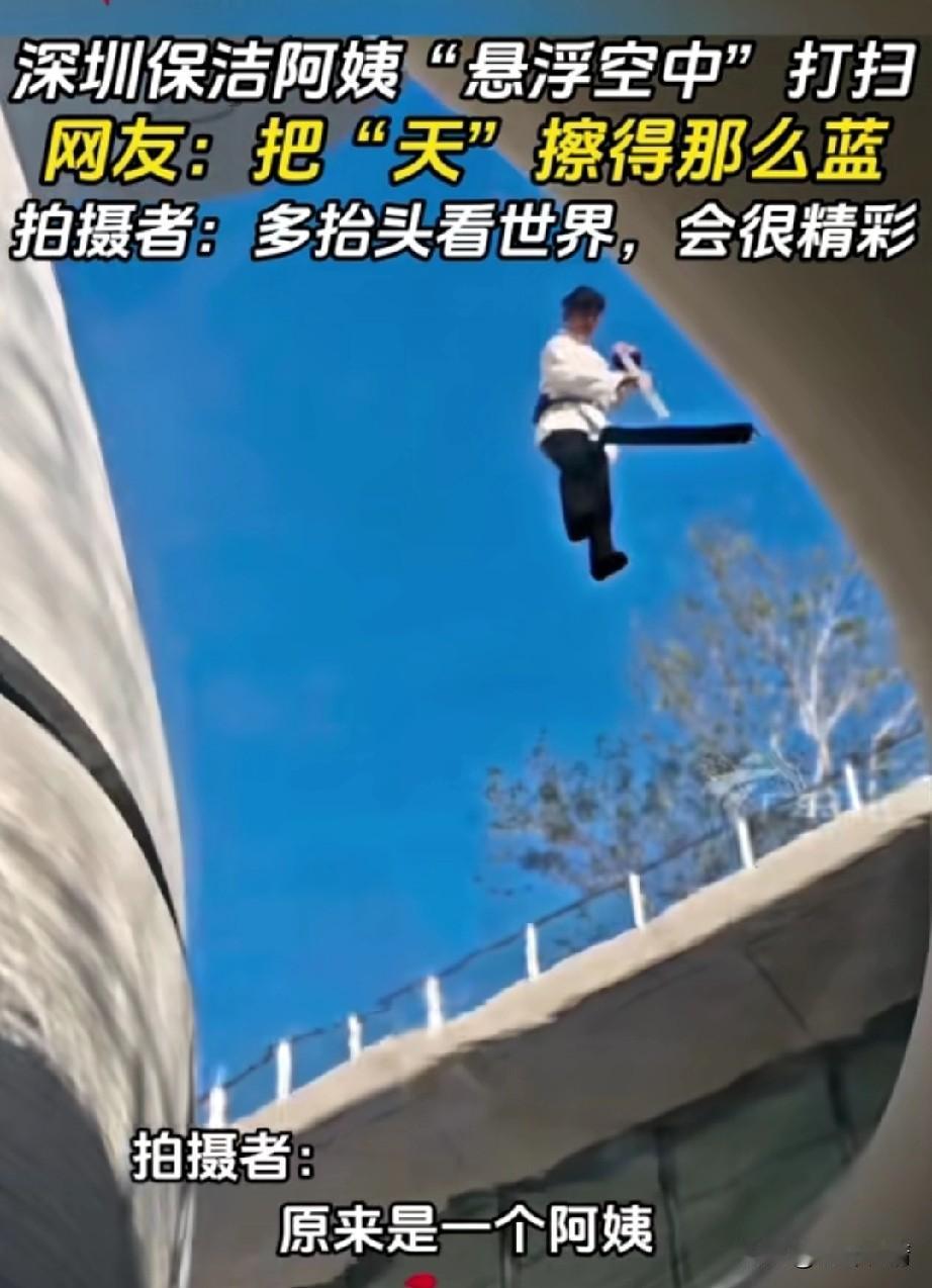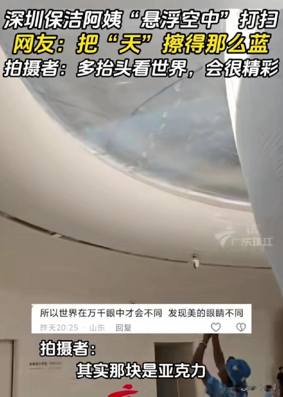 近日深圳保洁阿姨火了, 有网友拍摄她打扫卫生过程, 就像悬浮空中一样, 但是保洁阿姨正在打扫卫生, 因为这块面积用的是整块的亚克力板, 下面的客人刚好从那里过, 抬头看到保洁阿姨在打扫卫生, 觉得好玩就拍了下来, 没想到会爆火, 他的本意是让人们有时候也抬头看看天空,说不定有更好的美景, 大家全部被保洁阿姨的悬浮空中感兴趣,有时候生活中的不经意就会造就经典! 大家对于网友拍摄的保洁阿姨悬浮空中打扫卫生怎么看? 深圳资讯 保洁人员 暖心保洁阿姨 公司清洁阿姨 保洁阿姨休息间