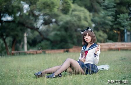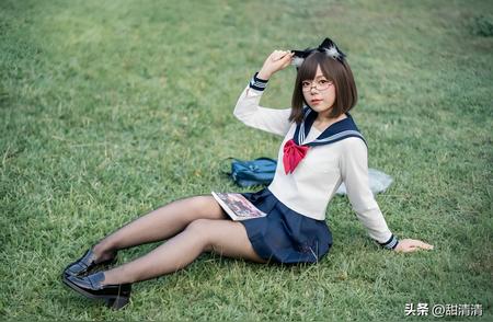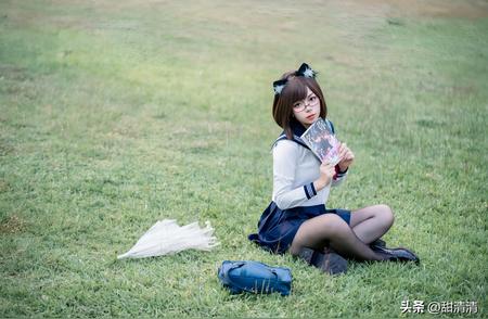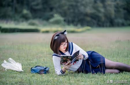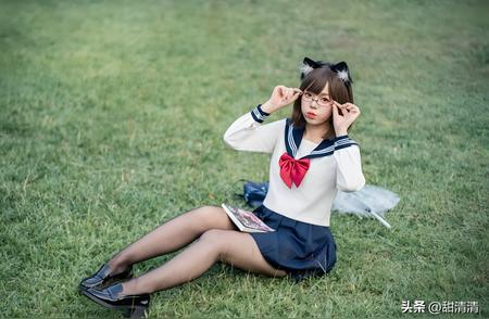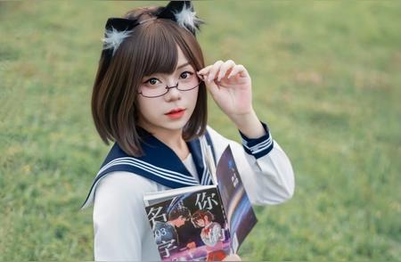 草地上少女身着水手服,头戴猫耳,手捧书籍,氛围清新自然。,无不良引导