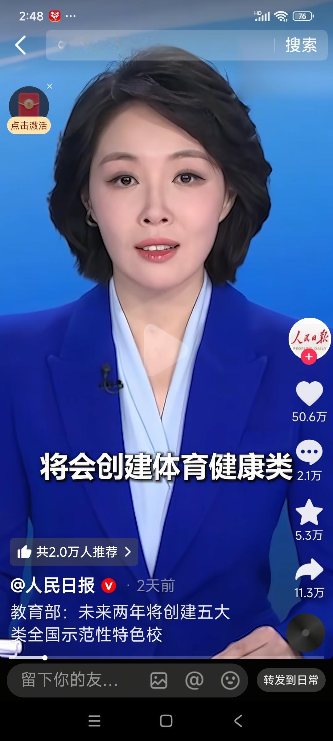 因材施教——五大类特色学校 让我们的孩子能文能武, 让我们的孩子是花成花是树成树。 人民日报从教育部了解到: 未来两年创建体育健康类、美育类、国防教育类、依法治校类、语言文字推广应用类等五大类全国示范性特色学校,其中计划创建青少年校园足球特色学校,体育传统特色学校等体育健康类学校9000所,美育类学校5000个,基地200个,国防教育类学校4000所,依法治校类学校300——400所,语言文字推广应用学校300所。希望我们的孩子在不久的将来都会有自己最喜欢的院校、最喜欢的专长!期待!!!
