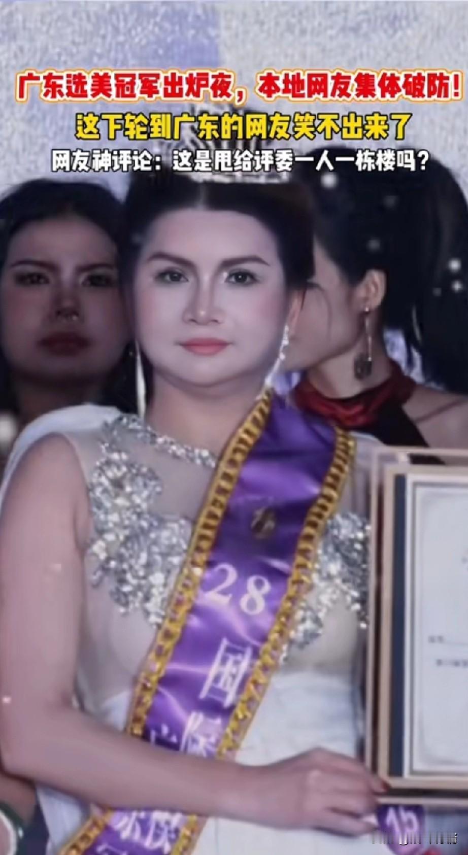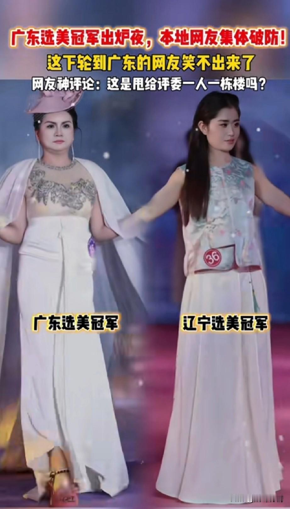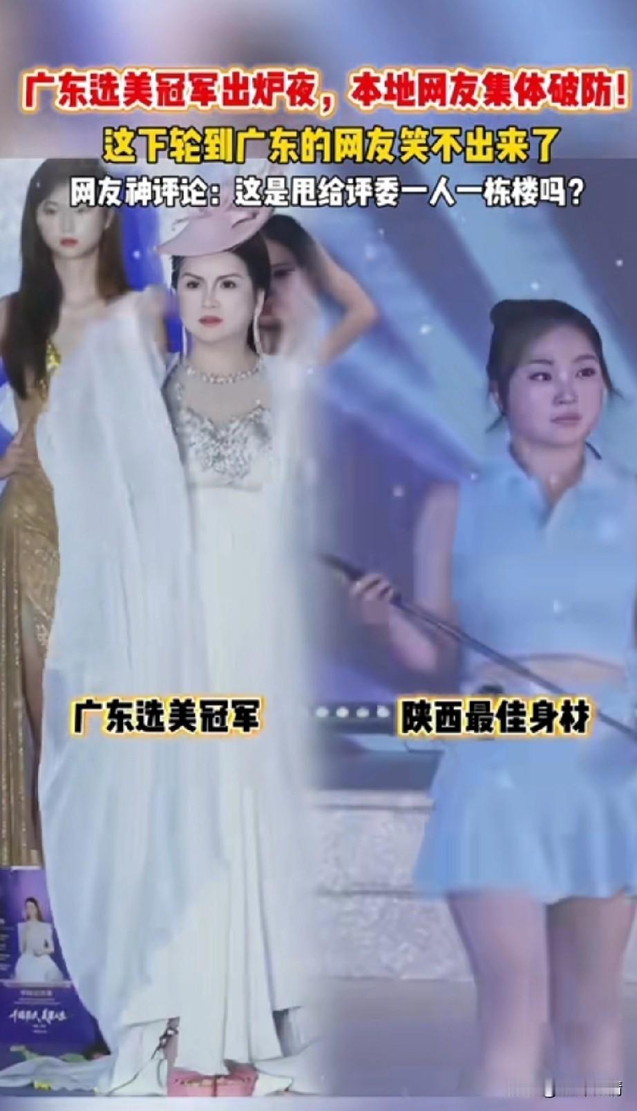 这下广东人笑不出来了, 之前陕西的最佳身材奖给了一个没脖子的女模特,大家都在表现陕西人的审美不行,如今广东选美冠军也诞生了, 这长相和身材也不比陕西的佳丽好多少,大饼脸加丰满的身材, 猛一看还以为是大妈呢? 结果人家就是选美冠军, 这些评委是不是被送了一套房, 眼光是越来越不行了, 这样的女子也是美, 这不会就是故意这样博眼球吧! 走大街上的普通路人都比这强吧! 大家觉得广东的选美冠军比陕西冠军强吗? 广东身边的事 陕西选美冠军 高清美女