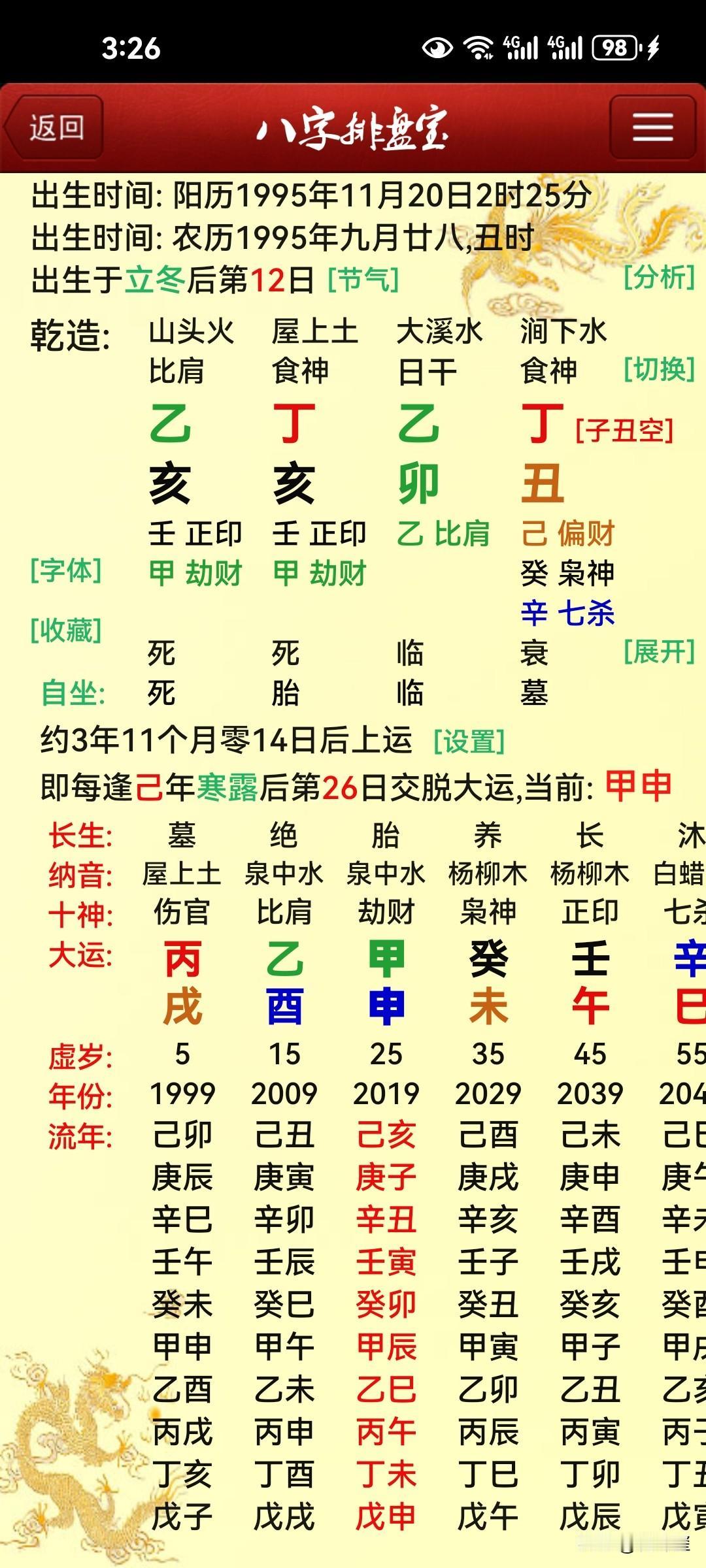 男测婚姻如何? 客户预约,前天下午来工作室,很着急,儿子1995年生人,至今婚姻没有着落,谈了几个女朋友,最终无果而终。父母挺着急,我说年龄也不大呀?你急什么,来人说,他弟弟家的侄子前两天都结婚了,感觉在人前抬不起头来。 对方报出出生年月日时,得图如下。 广大易友们,看看他儿子那年结婚呢?婚姻命理分析 恋爱关系测试 日柱看对象 四柱八字 四柱看配偶 日柱看姻缘