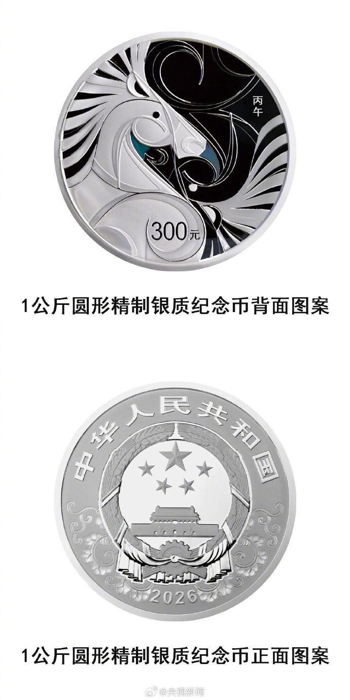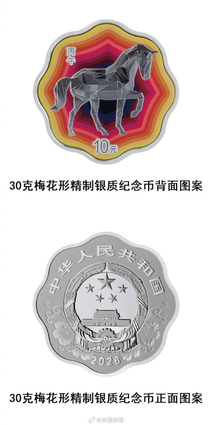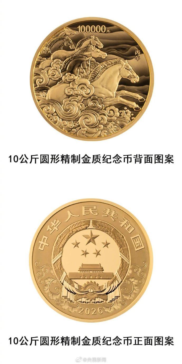 【马年纪念币来了】 中国人民银行定于11月26日发行2026中国丙午(马)年贵金属纪念币一套。该套贵金属纪念币共11枚,其中金质纪念币6枚,银质纪念币4枚,铂质纪念币1枚,均为中华人民共和国法定货币。纪念币的背面图案,有群马奔腾造型、母子马造型、剪影造型、剪纸造型等。(央视新闻)