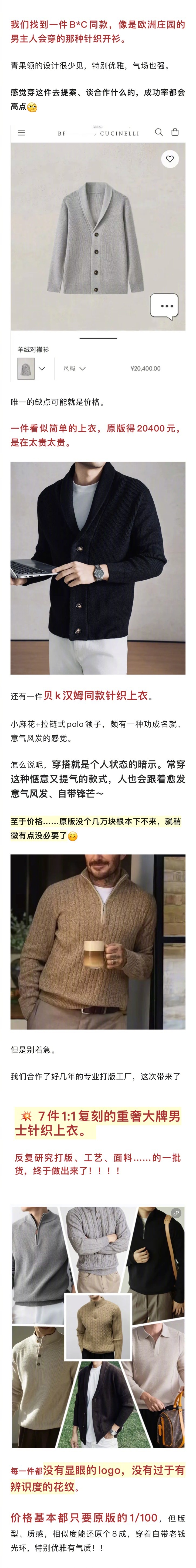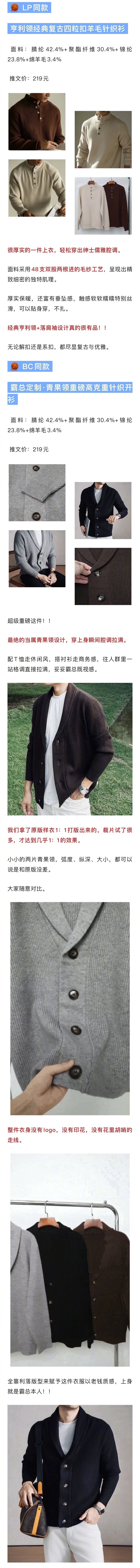 我们每年都会上的大牌女装系列一直广受好评,毕竟面料剪裁细节处理都很到位,实体店大几百的质量,价格却相当合适!后台也有不少催男装的,这次刚好安排一批,都是简单有质感的款式,立领开衫半高领都有,上身舒适不紧绷,显贵不老气有5个尺码可选,大部分身材的男士都能穿,到手只要219,性价比很高了