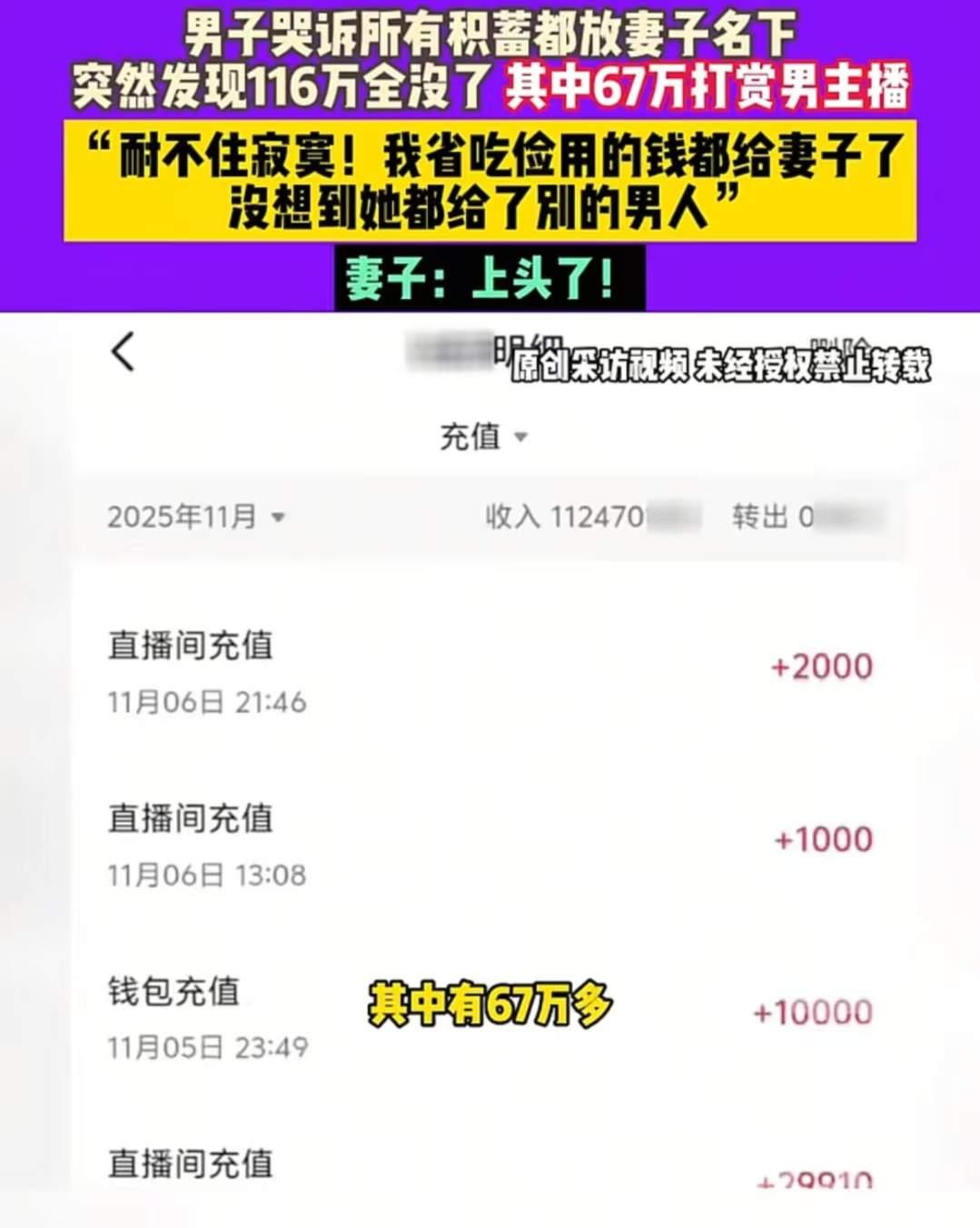 多万都交给妻子管。可万万没想到,116 万全都没了,其中 67 万打赏给了男主播!妻子:“主播很帅,叫我宝贝,我一个人在家耐不住寂寞,上头了!”男子:“我在外面省吃俭用,没想到她把钱都给了别的男人!” (来源:小莉帮忙) 河南男子的故事,似乎又一次揭开了现代婚姻中那些令人心碎的“盲点”。他辛苦拼搏,用了整整几年积蓄,终于攒下一百多万原本是为了未来的生活打算,却在一夜之间化为乌有——全部交给了妻子管理,结果却换来一场“血本无归”的惨痛教训。 你能想象吗?那一刻,他在外打工的汗水、辛苦、梦想,都变成了泡影。尤其是那67万元被打赏给一个男主播的细节,更像是一记重锤狠狠击打在无数普通家庭的心上。妻子的一句“主播很帅,叫我宝贝,我一个人在家耐不住寂寞,上头了”,是不是让你觉得荒唐又心酸?这不仅是个人的悲剧,更折射出某些婚姻关系中潜藏的信任危机和价值观偏差。 但你有没有想过,这背后隐藏了什么?是信任的崩塌?还是现代社会快速变迁带来的情感迷失?我们都知道,人的欲望和孤独在某些时刻像洪水一样难以控制。那位妻子,可能只是一时寂寞难耐,误入歧途,但更深层次的原因,是对婚姻的期待变了,还是对生活的迷失?这场“金钱与感情”的博弈,究竟是谁的错?又该由谁来买单? 更令人唏嘘的是,许多网友看完这个故事,第一反应不是谴责,而是愤怒和无奈。他们开始反思:我们的社会,是否在某些方面给了人们太多的“虚拟慰藉”?虚拟世界的光鲜亮丽,是否让一些人迷失了自己?而我们普通人,又该如何在变幻的社会中守住那份本真的信任和责任? 这个故事提醒我们:婚姻不是一个人的事,而是两个人的责任和信任的考验。在这个信息爆炸、诱惑无处不在的时代,保持清醒和理智,比任何时候都更重要。我们需要的,不仅是金钱的安全,更是心灵的守护。 或许,这场悲剧背后,有太多的无奈和未解的谜题。但它也唤醒了我们——在追求物质和虚荣的同时,更应该珍惜那份纯粹的信任和情感。每一个家庭、每一段婚姻,都是我们共同的责任。让我们用更多的理解和包容,守护彼此的幸福,而不是让“虚拟的泡沫”吞噬了现实的温暖。 你怎么看?这样的故事,是否也曾在你的生活中出现过?或许我们都应该从中汲取一些教训,重新审视自己的人生和感情。毕竟,幸福,从来都不是一夜之间的奇迹,而是细水长流的坚持与信任。