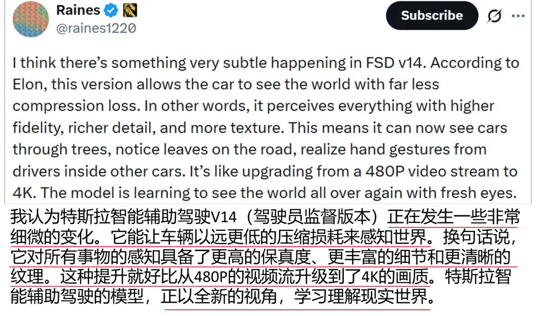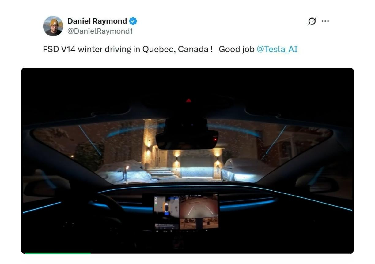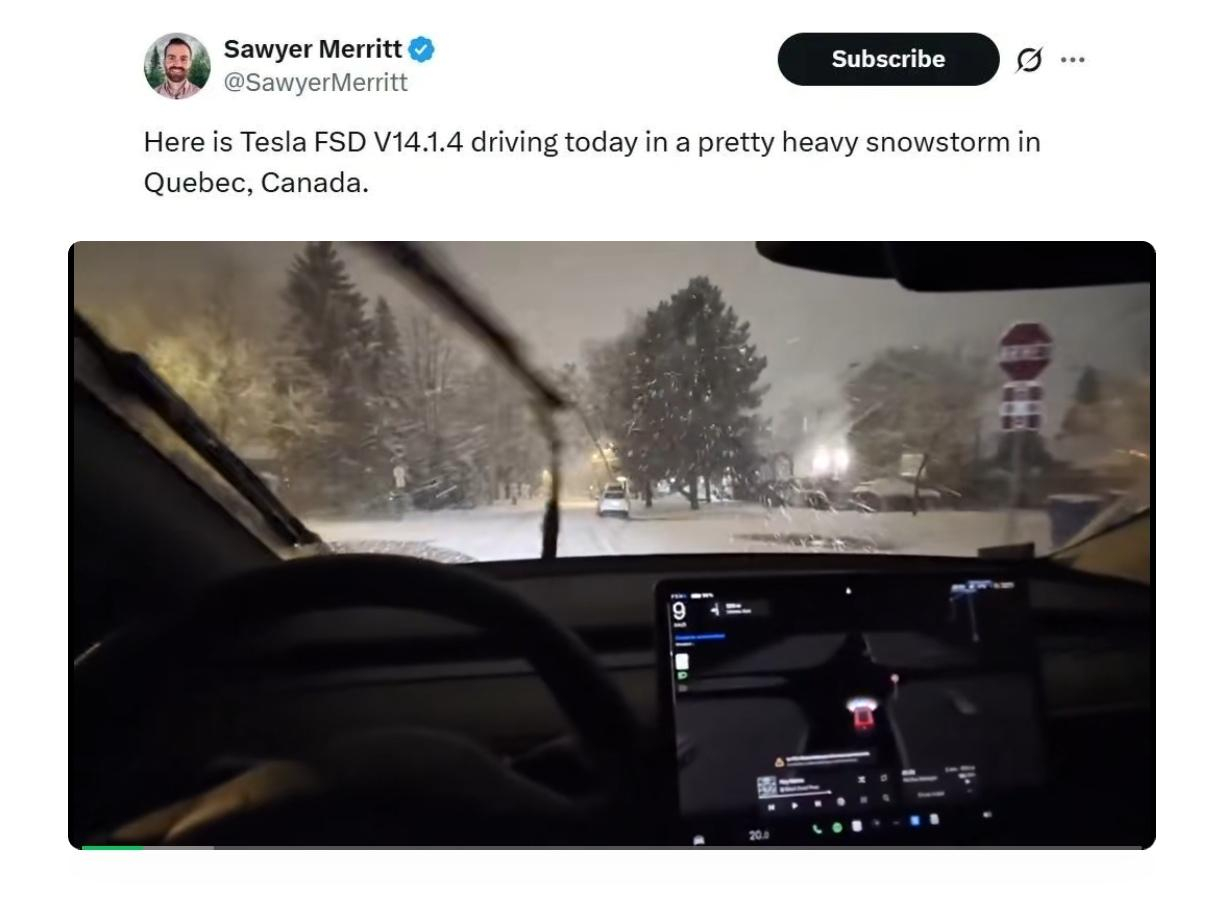 加拿大遭遇罕见暴雪,但特斯拉智能辅助驾驶 V14 在积雪数十厘米、能见度不足百米的魁北克路面上依然稳稳“扛住风雪”,频现高能操作。海外博主SawyerMerritt分享的视频中,特斯拉在风雪交加的公路上可以清晰自动识别路标、避让积雪路障,并精准变道,车速控制在安全范围内。博主感叹:“特斯拉智能辅助驾驶V14在魁北克的暴雪中表现完美,让我很有安全感!”在不少来自魁北克车主的真实分享中,特斯拉智能辅助驾驶的高能表现频频收获点赞。车主DanielRaymond1 记录了车辆从家中车库自动倒出启程、穿越魁北克冬雪覆盖的道路,最后安全停回车库的整个过程。他表示,特斯拉智能辅助驾驶V14全程就像老司机一样,让车辆一直保持非常丝滑平稳的状态,完全没有受到暴雪天气的影响。据了解,特斯拉坚持使用视觉处理方案,能够模拟人类感知机制并通过视觉架构与端到端神经网络技术路线。相比传统的激光雷达,不仅能够识别道路标识和手势信息,而且在动态场景中具备更强的自适应能力。此前,马斯克就在采访中表示,基于视觉方案的智能辅助驾驶技术是与现行道路系统最适配的,因为全世界的道路系统都是根据生物神经网络和眼睛设计的,而不是根据“从眼睛里发射激光”。人工智能领域博主raines1220分析提到,特斯拉智能辅助驾驶V14对所有事物的感知具备了更高的保真度、更丰富的细节和更清晰的纹理。“这种提升就好比从480P的视频流升级到了4K的画质。特斯拉智能辅助驾驶的模型,正以全新的视角学习理解现实世界。”截至2025年10月22日,搭载智能辅助驾驶的特斯拉车辆总行驶里程已达到100亿公里(约60亿英里)。随着真实路况数据的迅速积累,系统能力也在持续升级。外媒报道指出,特斯拉智能辅助驾驶V14版本已能够从容应对多种极端场景,例如主动避开道路障碍物、及时为应急车辆让行,甚至能自主寻找最佳停车位。