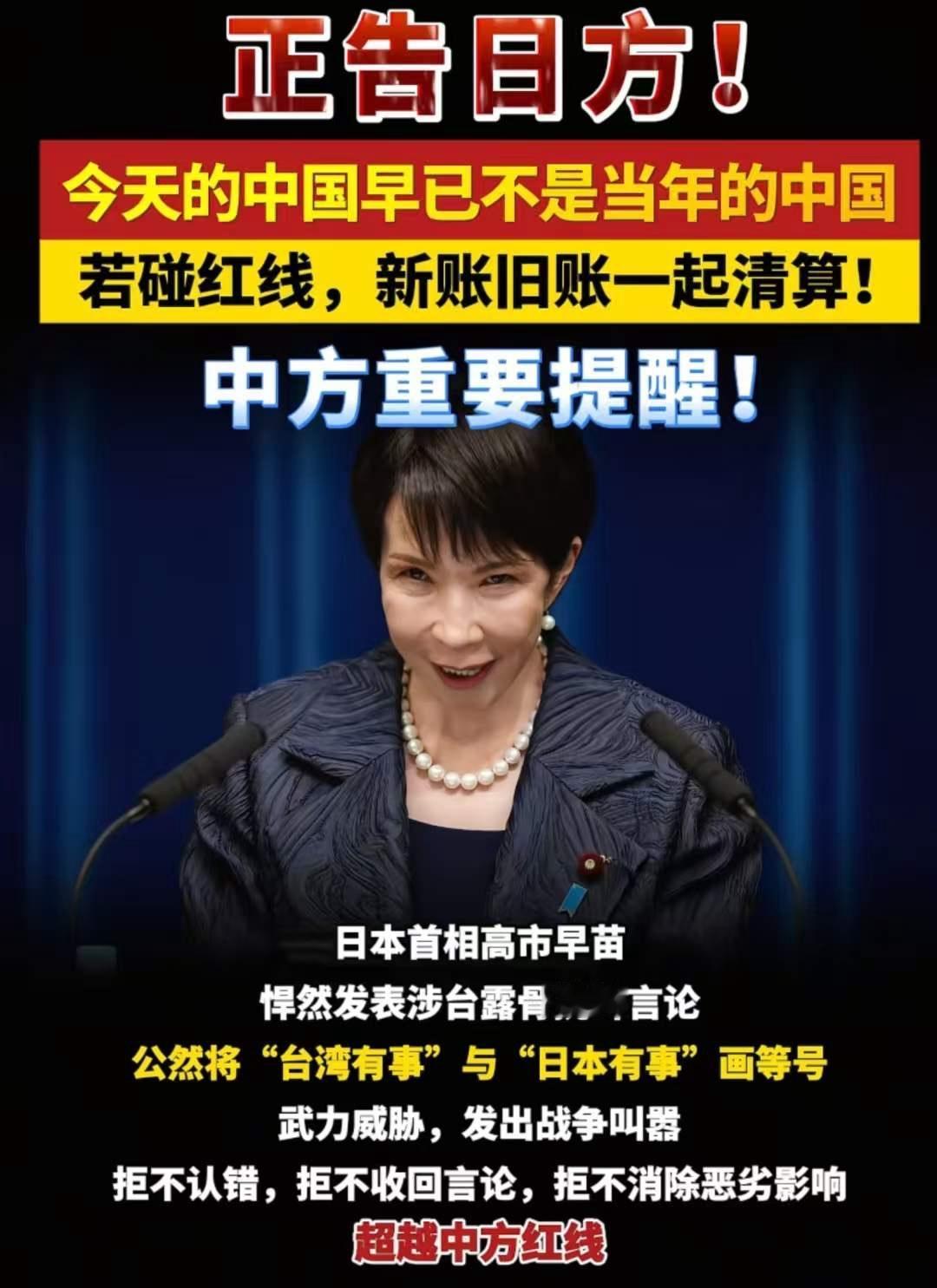 高市早苗的“硬碰硬”:上任月余,为何将中日关系推向冰点? 上任仅一个多月,日本新任防卫大臣高市早苗就以一系列激进言行,将中日关系拖入了近年来的最低谷。这位素有“搞事早苗”之称的政治人物,似乎低估了中国维护国家主权的决心和实力。 骑虎难下的外交困局 高市早苗上任之初,便展现出对华强硬姿态,不仅在钓鱼岛问题上大放厥词,更在军事部署上频频挑衅。然而令她始料未及的是,中国此次的反击力度远超预期。 与以往不同的是,中国此次采取了“以硬碰硬”的策略。当高市早苗试图通过制造事端来提升自身政治资本时,中国不仅没有退让,反而以更强硬的姿态予以回击。这种“你打你的,我打我的”策略,让高市早苗陷入了自己制造的困局。 钓鱼岛巡航:中国的“顶级阳谋” 就在高市早苗疲于应对之际,中国海警船持续在钓鱼岛海域进行常态化巡航。这一行动堪称“顶级阳谋”——既完全符合国际法,又明确宣示了主权立场 中国的巡航行动有法可依、有理有据,让日方难以找到实质性的反驳理由。这种既保持克制又坚定立场的做法,展现了中国在外交博弈中的成熟与智慧 强硬背后的战略定力 分析人士指出,中国此次的强硬态度并非一时冲动,而是基于对国家利益的清醒认识和对国际形势的准确判断。在涉及国家主权和领土完整的问题上,中国有着不可逾越的底线。 高市早苗的失误在于,她错误地估计了中国维护核心利益的决心。当中国展现出前所未有的坚定立场时,日方才发现自己手中的筹码远远不够。 教训与启示 这一事件给地区局势带来重要启示:任何试图通过挑衅来获取政治利益的做法,都可能适得其反。在国际关系中,尊重彼此核心利益和重大关切,才是维护地区和平稳定的正道。 对于高市早苗而言,如何从当前困境中寻找出路,将考验其政治智慧。而对于中日关系来说,这或许也是一个重新校准的契机。高市早苗内阁 日本对华态度