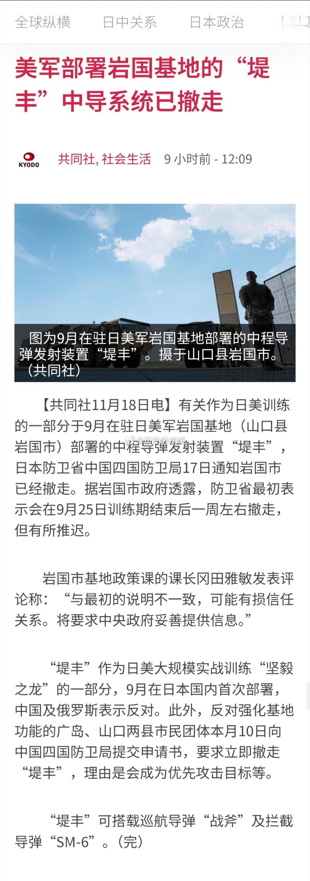 有关作为日美训练的一部分于9月在驻日美军岩国基地(山口县岩国市)部署的中程导弹发射装置“堤丰”,日本防卫省17日通知岩国市已经撤走。据岩国市政府透露,防卫省最初表示会在9月25日训练期结束后一周左右撤走,但有所推迟。岩国市基地政策课的课长冈田雅敏发表评论称:“与最初的说明不一致,可能有损信任关系。将要求中央政府妥善提供信息。”“堤丰”作为日美大规模实战训练“坚毅之龙”的一部分,9月在日本国内首次部署,中国及俄罗斯表示反对。此外,反对强化基地功能的广岛、山口两县市民团体本月10日向防卫省提交申请书,要求立即撤走“堤丰”,理由是会成为优先攻击目标等。