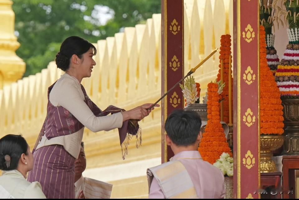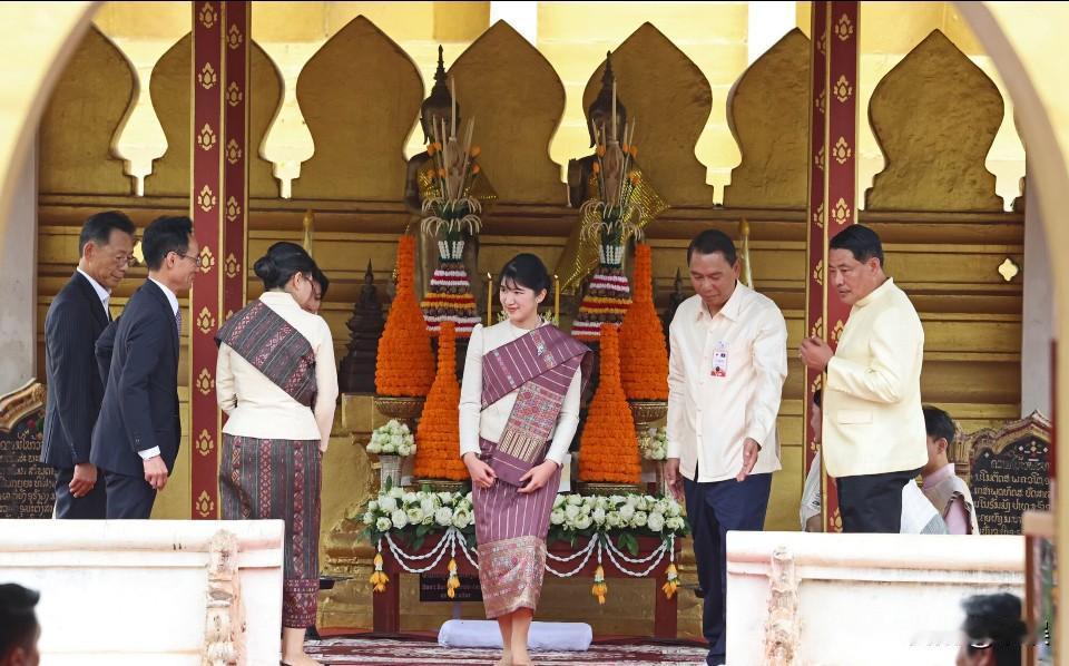 爱子公主参观塔銮寺 就在今日,爱子公主参观了位于万象的塔銮寺。 在塞塔提拉国王像前,爱子公主穿着老挝传统服饰欣赏了乐队与传统舞蹈的表演,随后向佛像献花、点灯,并绕行舍利塔,最后听取了讲解。 难怪爱子一直在减肥,看来全家达成一致目标了,连雅子出席公务也比以前开心。[机智] 日本王室公主