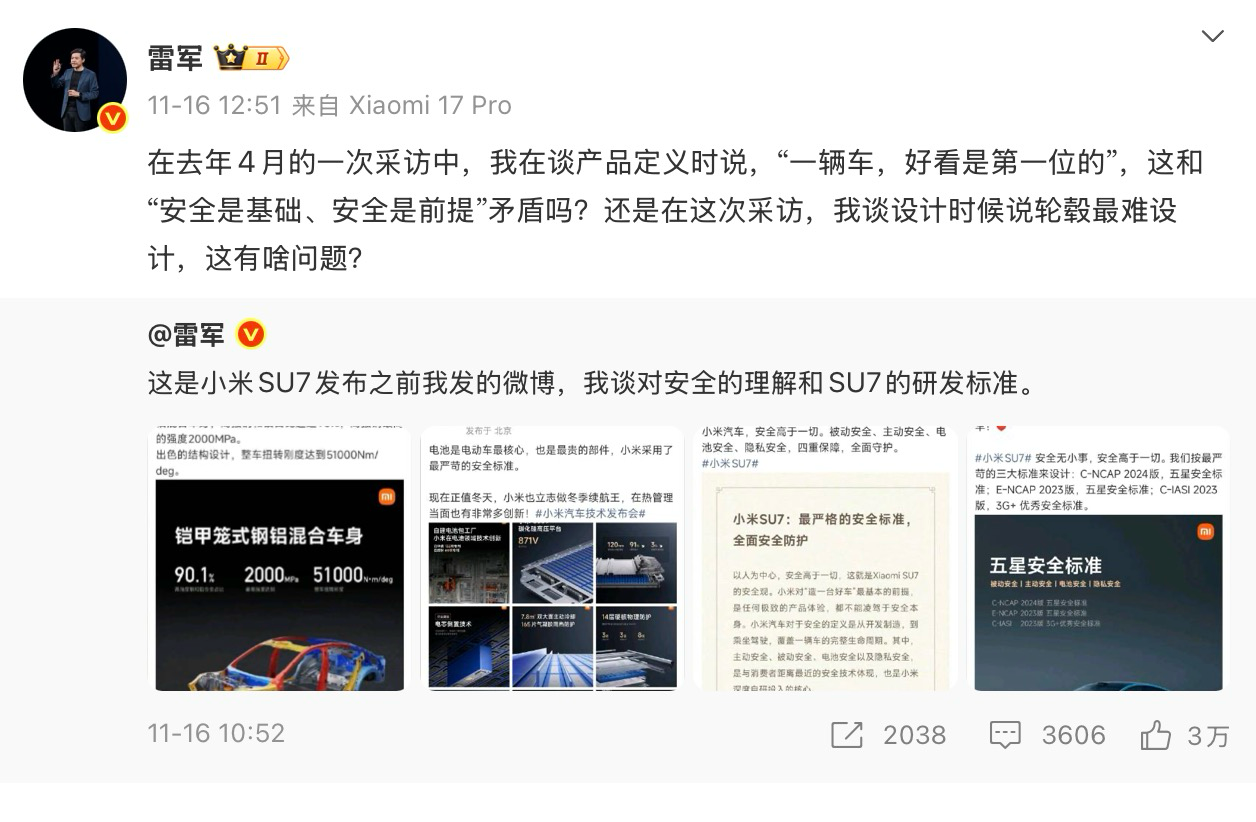 在11月16日,雷军就汽车的安全与美观连发多条微博,称“车辆好看”与“安全是基础”并不矛盾,疑似回应小米汽车更注重美观、其次才是安全的质疑。