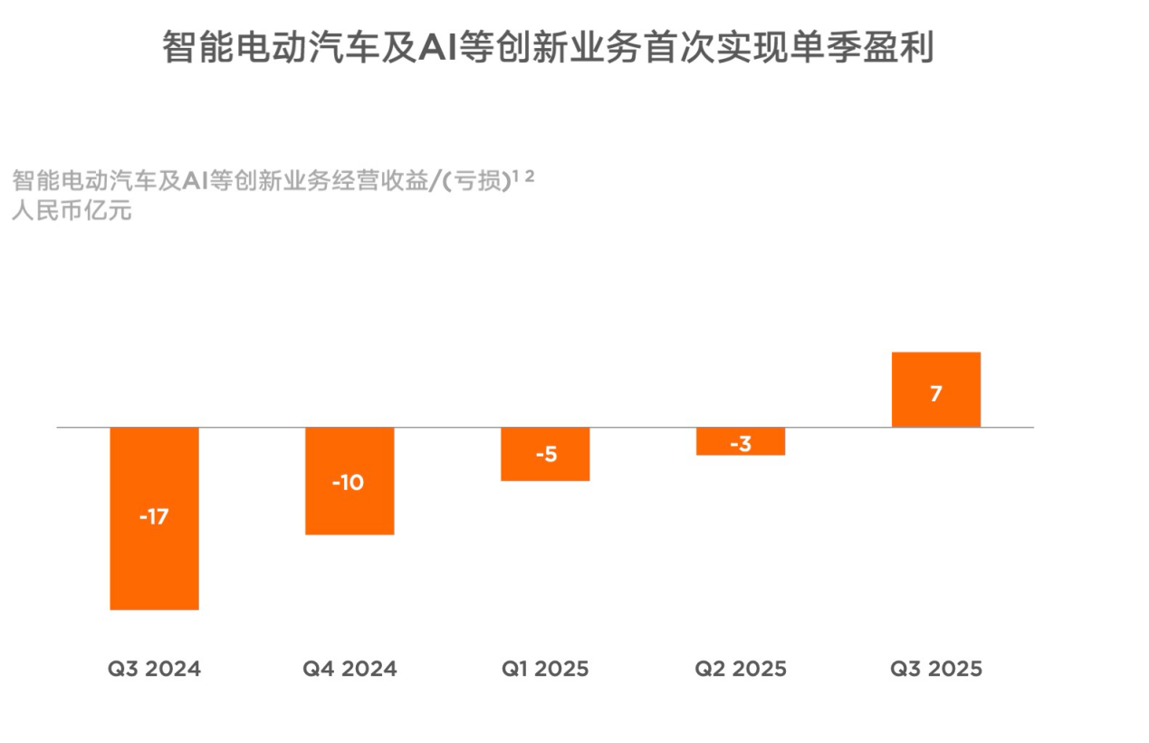 小米智能电动汽车和AI等创新业务(下称创新业务)是集团内部增速最快的业务板块,相较于去年同期大幅增长。今年第三季度这一业务营收达到290亿元,同比增长199.2%;净利润7亿元,首次实现季度盈利。