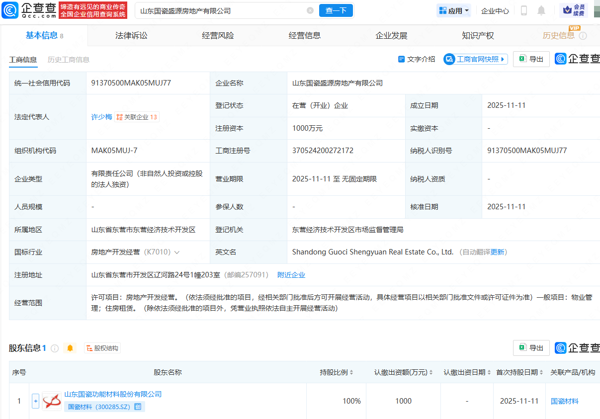 企查查APP显示,近日,山东国瓷盛源房地产有限公司成立,法定代表人为许少梅,注册资本为1000万元,经营范围包含:房地产开发经营;物业管理;住房租赁。企查查股权穿透显示,该公司由国瓷材料(300285)全资持股。