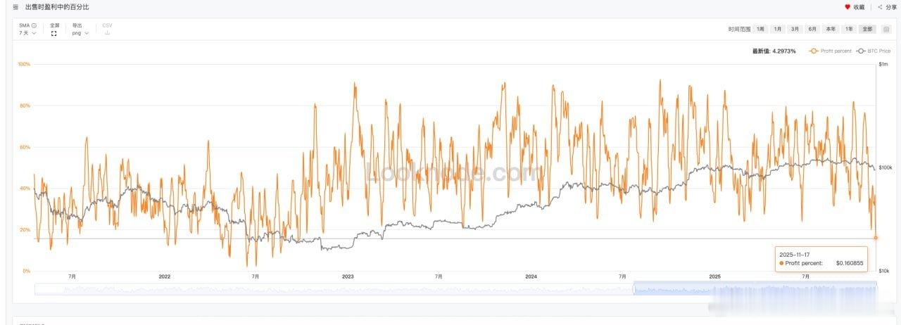 链上指标:比特币出售时盈利中的百分比(Percent Volume in Profit)7日均值是2023年以来的最低值,指标值的极小值经常对应BTC价格的短期底部。