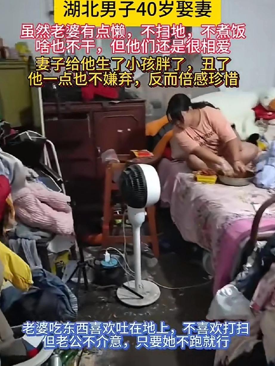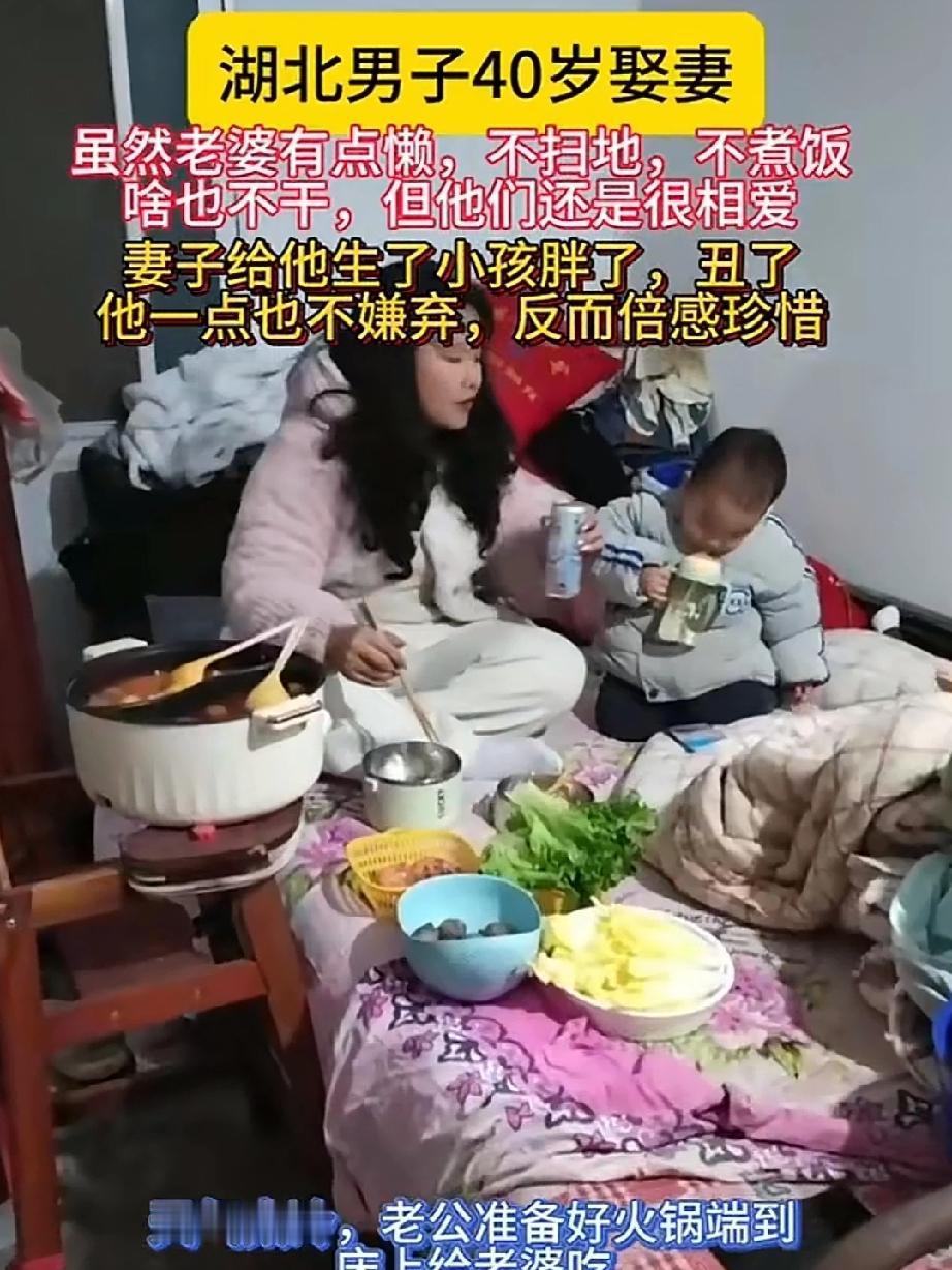 湖北一40岁男子娶妻,妻子被庞成了公主,被子不叠碗筷不刷,天冷了,丈夫准备了火锅端到床上给妻子吃,屋内凌乱不堪,妻子虽然有点懒,不扫地,不做饭,啥也不干,但丈夫从不介意,依然很爱她。 真是情人眼里出西施,妻子的存在胜过一切,遇到了好丈夫缺点也会变成优点,懂得珍惜与妻子相处的每一天,丈夫给不了妻子大富大贵,但能给她温暖如初,顺心如意,让她每天活在快乐中,这也许是有些人追求不到的婚姻!