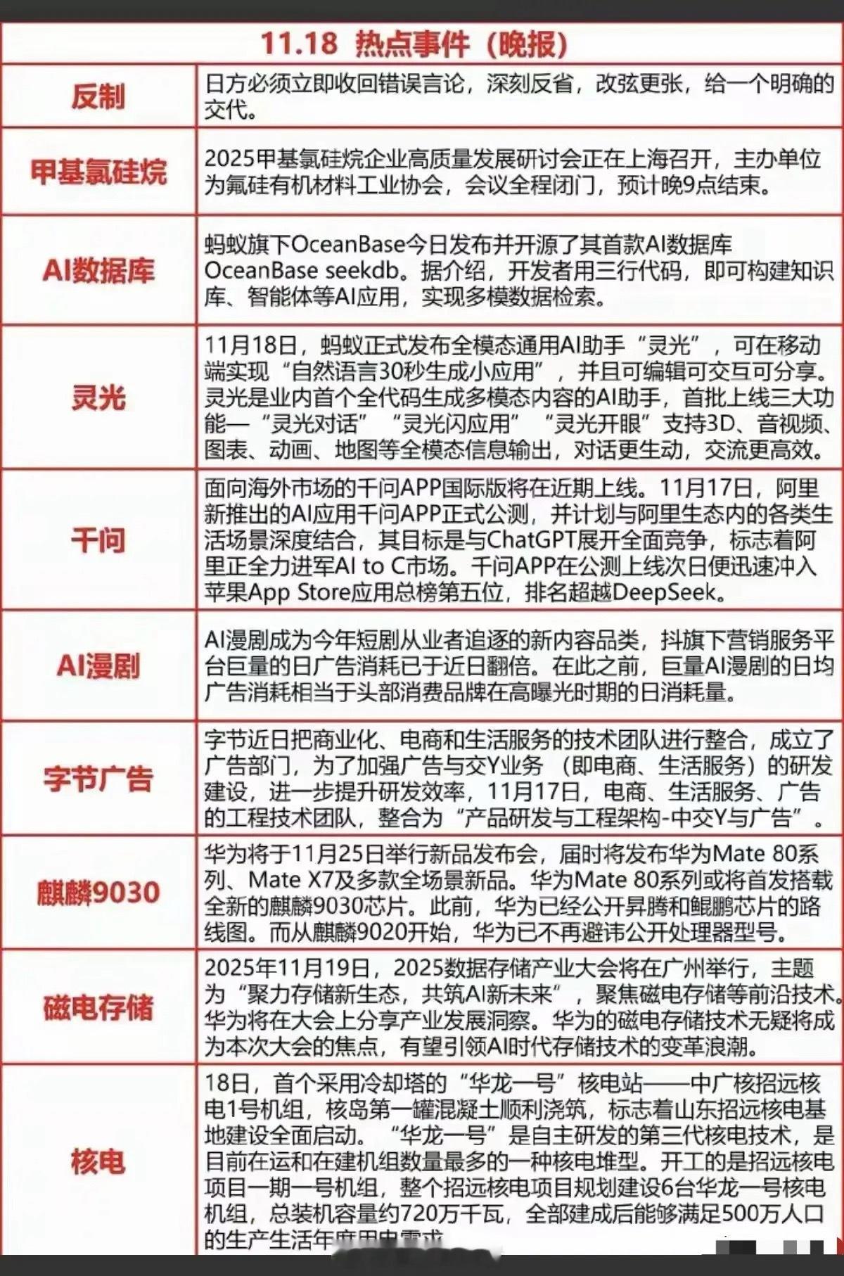 11.18财经热点晚报:十大核心赛道全梳理,AI+芯片+核电领涨风口今日财经热点聚焦外交回应、产业升级、AI技术落地、芯片创新等核心领域,十大热门板块联动相关产业链,以下为各板块核心标的及逻辑解析:一、反制(国防军工赛道)对应日方错误言论的外交回应,国防军工需求获支撑:• 中船防务:海军装备核心供应商,船舶及海洋工程装备技术积淀深厚,国防订单稳定性强;• 中航沈飞:国内战斗机整机制造龙头,主力机型生产任务饱满,业绩增长确定性高;• 航天彩虹:军用无人机需求旺盛,同时布局民用市场,无人机及复合材料业务多元化拓展。二、甲基氯硅烷(有机硅产业链)氟硅材料产业会议催化,有机硅产业链受益于供需优化:• 三友化工:有机硅产能居国内前列,甲基氯硅烷为核心原料,受益于行业格局改善;• 合盛硅业:全球硅基新材料龙头,甲基氯硅烷产能领先,成本控制能力强,行业地位稳固;• 兴发集团:依托磷硅协同优势,氟硅产业链布局完善,甲基氯硅烷产能配套充足,竞争力突出。三、AI数据库(数据库+算力支撑赛道)蚂蚁发布开源AI数据库,算力与数据库协同需求提升:• 中科曙光:布局数据库与AI算力基建,硬件支撑能力适配AI数据库落地,业务协同性强;• 神州数码:代理+自主研发双轮驱动,AI数据库推广有望带动相关业务规模增长;• 海量数据:专注数据库管理与服务,AI数据库拓展应用场景,行业需求增长利好业绩。四、灵光(AI交互技术赛道)蚂蚁发布全模态AI助手,多模态交互技术成核心看点:• 科大讯飞:AI语音及助手领域龙头,多模态交互技术积累深厚,契合全模态发展趋势;• 拓尔思:自然语言处理(NLP)技术领先,为AI助手提供语义理解支持,商业化落地加速;• 汉王科技:布局多模态交互技术,在人机交互、内容生成领域有技术储备,受益于产品推广。五、千问(阿里生态赛道)阿里AI应用公测落地,阿里生态企业联动受益:• 浙大网新:与阿里AI领域深度合作,参与生态项目,协同效应带动业务增长;• 三江购物:阿里系参股企业,聚焦生活场景,千问与场景融合带来业务联动机会;• 君正集团:参股蚂蚁集团,受益于蚂蚁与阿里AI领域协同发展,投资收益预期提升。六、AI漫剧(IP+内容赛道)抖音AI漫剧热度攀升,IP资源变现渠道拓宽:• 中文在线:海量IP储备+短视频平台合作紧密,AI漫剧推动IP动漫化开发,变现能力增强;• 掌阅科技:数字阅读内容丰富,依托文学IP布局AI漫剧创作,拓展AI内容生产领域;• 捷成股份:手握优质影视版权资源,可对接AI漫剧创作需求,合作空间广阔。七、字节广告(广告代理赛道)字节整合广告与电商团队,广告投放效率提升催化需求:• 省广集团:字节广告代理核心伙伴,整合后投放效率提升,带动代理业务规模增长;• 蓝色光标:与字节营销领域深度绑定,广告与电商整合后需求增加,受益于投放量提升;• 天龙集团:字节系专业广告服务商,专注互联网营销,业务扩张直接带动代理收入增长。八、麒麟9030(芯片产业链赛道)华为新芯片发布预期,芯片国产替代进程加速:• 中芯国际:华为芯片供应链核心企业,国产替代背景下,芯片制造需求持续提升;• 长电科技:芯片封装测试龙头,麒麟芯片量产带动封装服务需求,业务增量明确;• 沪硅产业:半导体硅片核心供应商,为芯片生产提供关键材料,技术支撑产业链发展。九、磁电存储(存储赛道)华为将分享磁电存储技术,存储行业技术升级催化:• 兆易创新:存储芯片设计龙头,布局前沿存储技术,有望对接磁电存储相关应用;• 北京君正:覆盖存储及处理器芯片,磁电存储发展带动行业需求,受益于技术升级;• 江波龙:存储产品解决方案商,磁电存储推广拓展应用场景,有望切入相关供应链。十、核电(核电产业链赛道)华龙一号核电站开工,产业链订单迎来释放:• 中国广核:国内核电运营龙头,招远核电项目主体,装机容量提升支撑业绩增长;• 中国核建:核电工程建设龙头,承担华龙一号建设任务,项目开工带动工程订单增加;• 沃尔核材:核电绝缘材料核心供应商,项目建设拉动材料需求,业务增长确定性强。总结今日十大热点板块覆盖国防、科技、新能源、消费等多个领域,既体现了科技自主背景下AI、芯片、存储等赛道的技术突破与商业化落地,也反映了传统产业扩张与互联网企业业务整合的发展节奏,为市场提供了多元投资线索。风险提示:本文资讯及数据来源于网络公共信息,仅供参考,不构成任何投资建议。理财有风险,入市需谨慎。