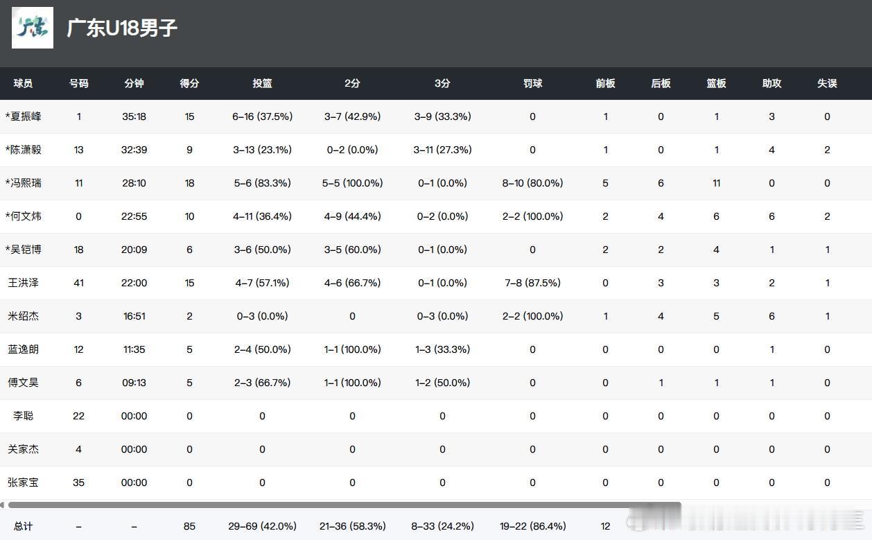 数据统计出来了,今天是冯熙瑞打最好一场球了吧,逮着山东内线欺负,感觉今天王洪泽发挥不太好但是不声不响拿了15分,冯熙瑞18分11篮板