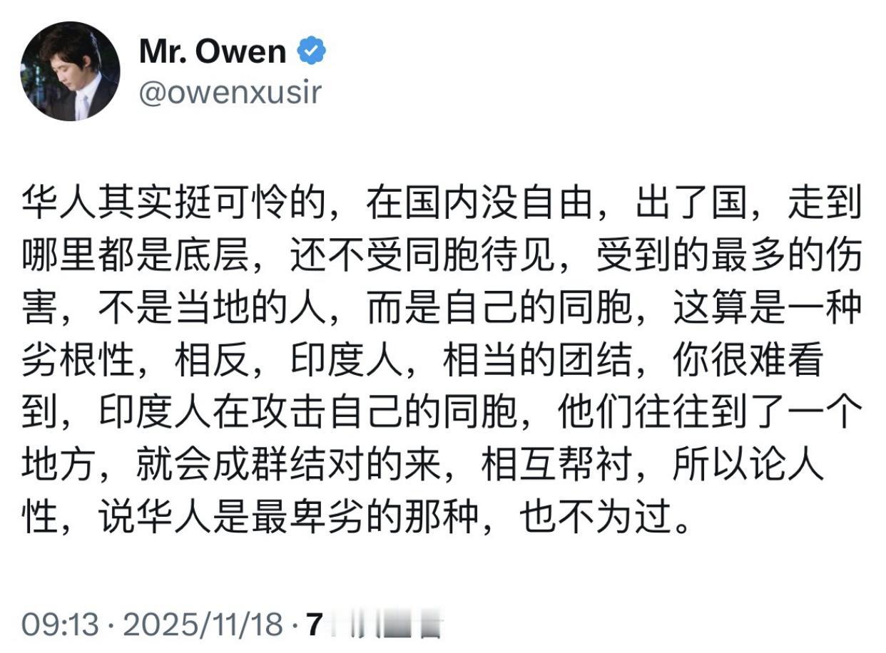 润到美国的殖人抱怨道:他在国内不自由,跑到美国获得了自由,却还是个底层人,还不受同胞待见,受到的最大伤害不是来自美国本地人,而是同胞,与之相反,他有点羡慕印度人了,印度人移民到哪里都很团结、不互相攻击,印度人到一个地方,都会成群结队的来、相互帮衬,论人性,印度人更好。