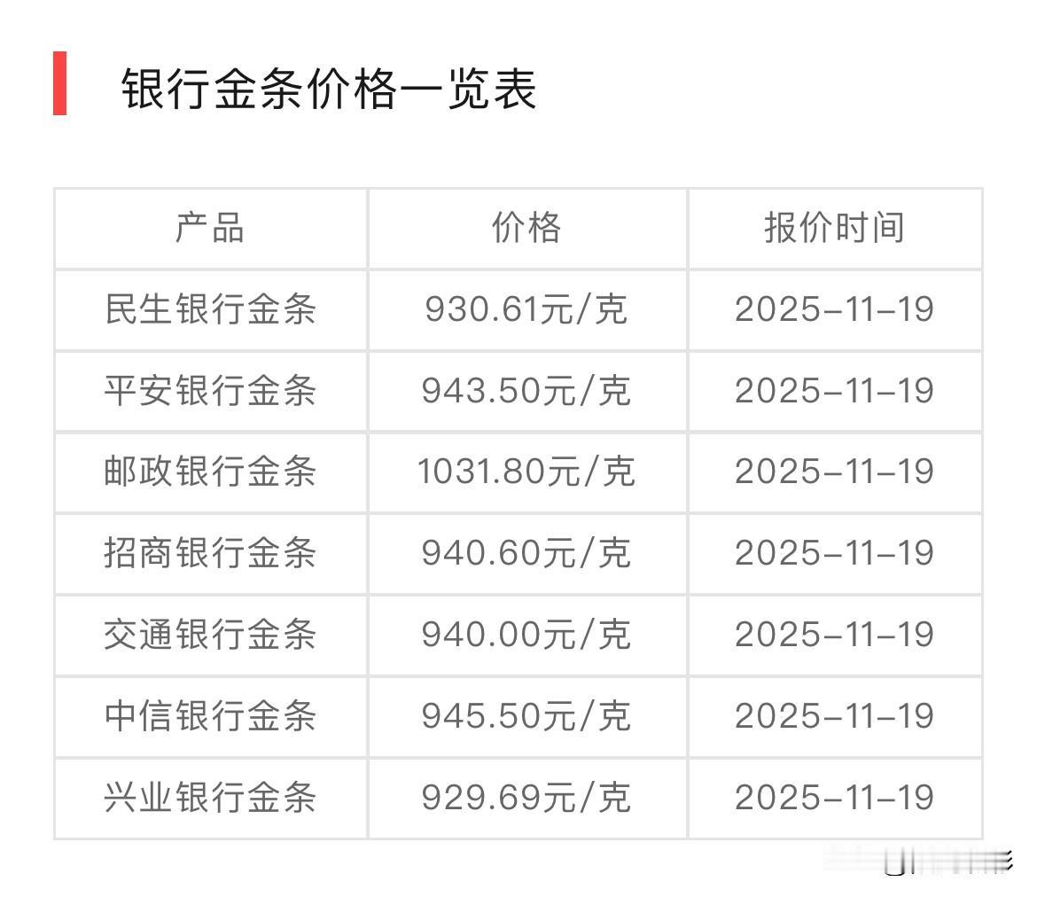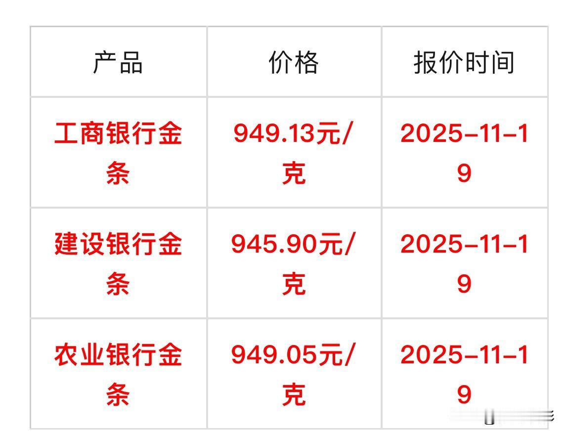 快看 最新金条价格查询! 今日信息: 工商银行金条价格:949.13元元/克, 建设银行金条价格:945.90元元/克, 农业银行金条价格:949.05元/克, 民生银行金条价格:930.61元/克, 招商银行金条价格:940.60元/克。 同比与昨天各大银行金条价格都有所下降, 所有信息,都只是提供参考! 理财有风险,投资需谨慎! 金条行情 银行金条 投资金条 银行金条价 金条避坑 金条市场 投资金条金价