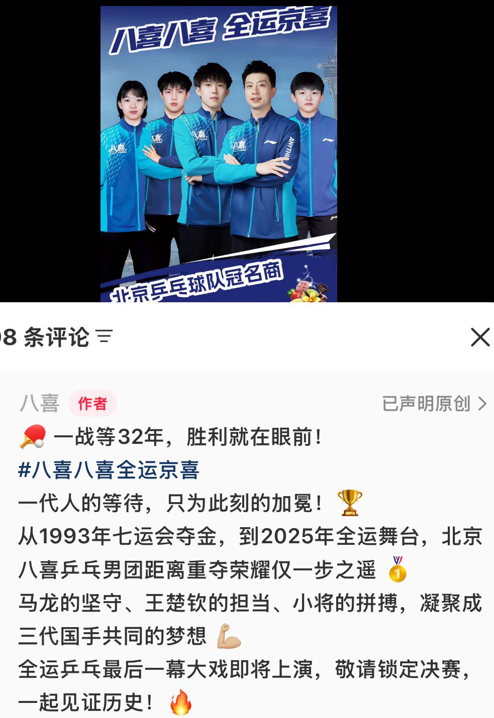 王楚钦VS樊振东巅峰对决在即——北京队发文一战等32年,胜利就在眼前! 一代人的等待, 只为此刻加冕🫅! 从1993年, 7运会夺金, 到2025年,北京队再一次 闯进决赛, 北京男团离夺冠🏆仅仅一步之遥…… 请一起见证这历史时刻! 11月20日 男团决赛, 北京VS上海 北京加油, 王楚钦加油, 上海加油, 樊振东加油! 北京男团,上海男团, 轻装上阵,不想赛果, 打好当下每一球, 时间不语, 热爱与拼搏之心永不停歇, 身披红衣,再战赛场, 已经是最大的惊喜, 感谢现役,如愿乒乓🏓…… 加油北京 上海!