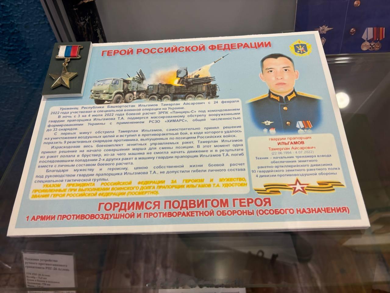 莫斯科一座鲜为人知的防空部队博物馆里,陈列着各种被击落的导弹和无人机: 包括美制ATACMS弹道导弹、GMLRS制导火箭弹、“哈姆”反辐射导弹和苏制“圆点U”弹道导弹的残骸等。此外,还有一些英雄事迹和遗物展示,其中一个2022年7月阵亡的“铠甲”车长事迹(图6)翻译如下:被授予“俄罗斯英雄”称号的来自巴什科尔托斯坦共和国的塔梅尔兰·艾萨罗维奇·伊尔加莫夫准尉于2022年2 月24日参加了在乌克兰进行的特别军事行动。2022年7月3日至4日夜间,由近卫准尉T.A.伊尔加莫夫指挥的“铠甲-S”弹炮结合防空系统作战小组遭到乌克兰武装部队使用“海马斯”多管火箭炮的猛烈炮击,总共有多达33枚火箭弹来袭。从炮击的最初几分钟起,塔梅尔兰·伊尔加莫夫就投入反导战斗并独立指挥摧毁空中目标,期间他成功摧毁了九枚射向俄军阵地的敌方火箭弹。塔梅尔兰·伊尔加莫夫指挥的防空导弹系统弹药全部耗尽后,他决定行军转移阵地。但就在这时,一枚火箭弹击中了掩体防护墙,车辆无法继续前进。随后,又有两枚火箭弹击中了他,近卫准尉塔梅尔兰·伊尔加莫夫和他的全体车组乘员阵亡。由于勇气和英雄主义,在近卫军少尉伊尔加莫夫·T·A的领导下,战斗小组以自己的生命为代价,阻止己方阵地其他人员的死亡。根据俄罗斯联邦总统令,准尉T.A.伊尔加莫夫因其在履行军事职责中表现出的英勇无畏精神,被追授俄罗斯联邦英雄称号。生前所在部队:第1防空集团军第4防空师第93近卫防空导弹团。