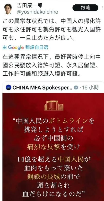 不知悔改!日本议员叫嚣“全面禁止中国人入境”,日网民:成事不足,败事有余 中方对日本的反制手段升级,让一批日本右翼政客相当愤怒。他们张牙舞爪,试图用口头的叫嚣来吓住中国人。一个名叫吉田康一郎的右翼议员,近日就在社媒上宣称,日本应该停止向中国公民发放所有种类的签证,以及永久居留权,全面禁止中国人入境。   之前日本首相高市早苗在国会公然说台湾的坏话,这番话粗暴干涉中国内政,狠狠踩中中方核心利益红线,当即引来中国多部门严正抗议。   中方接着就出了一系列管控措施,精准打在日本经济的痛处上,把日本右翼逼得坐不住。   中国电影市场最先有了反应,《蜡笔小新:炽热的春日部舞者们》《工作细胞》这些原定近期上的日本电影,全宣布暂时不上了。引进方和发行方都说明,这次调整是综合看了市场情况和国内观众心情后,才做的稳妥决定,每一步都透着对大家意见的尊重。   紧接着中国旅游市场的动作,让日本旅游业一下子感到了透心凉。好几家大型国有旅行社从16号起,彻底停售所有日本游产品,不管是跟团还是自由行,全不接了。   旅行社工作人员说得明白,现在两国这形势,就是做这个决定的根本原因,相关签证手续也跟着停办,已经交钱的游客能免费退款。有游客在旅行社官网搜“日本”“东京”这些词,页面上根本找不到相关旅游产品了。   中国外交部和文化和旅游部也先后发声,外交部14日提醒中国公民尽量别去日本,文旅部16日就跟进出了旅游预警。航空公司马上响应政策,不少航司针对飞日本的航线发了通知,符合条件的机票能免费退改,这下把中日人员往来的通道又收窄了不少。   中日官方交流也受了影响,北京-东京论坛按中方要求宣布延期,中日联合搞的舆论调查结果发布也搁置了。   中国外交部17号回应时说得很清楚,高市早苗涉台的挑衅话,把中日关系的政治基础都破坏了,相关交流活动的环境和条件早变了,这笔账全该算在日方头上。   江苏徐州代表团也取消了去日本爱知县半田市的访问,半田市15号收到徐州方面的邮件,说因为“有重要公务”推迟访问,新日子还没定下来。   就是这些精准有力的反制,把吉田康一郎这类右翼政客气红了眼。这个政客不光在签证问题上胡咧咧,之前转发中国驻日大使的帖子时,还说过更离谱的话——他声称日本殖民台湾这事是国际公认的,新中国没签过投降文书,根本没资格说这事儿。   这话一下子就暴露了他歪曲历史的真面目,分明是在否定二战的成果。   中国作为二战战胜国的地位,早被国际社会认下来了,哪能凭他一个政客胡说八道就改变?世界上只有一个中国,台湾是中国不可分割的一部分,这更是全世界都认的理儿。   吉田康一郎说这话,说白了就是在给日本殖民历史擦屁股,和高市早苗的涉台歪理简直是一个模子刻出来的,足见日本右翼已经狂到没边了。   更讽刺的是,吉田康一郎的逻辑全是双标。按他“没签投降文书就没话语权”的说法,俄罗斯作为前苏联的继承者,也没和日本签新的投降协议,可俄罗斯实际控制南千岛群岛这事儿,这位激进议员却闭着嘴不敢提。   这种欺软怕硬的德性,正好戳穿了日本部分政客的虚伪——谁能真治得了他,他就对着谁点头哈腰。   吉田康一郎喊着“全面禁止中国人入境”,在日本网上没招来支持,反而被骂惨了。   好多日本网友跑到他社交账号下面反驳,“成事不足,败事有余”这句评论被反复点赞,一直顶在最上面。这些网友心里门儿清,中国游客和中日贸易对日本经济意味着什么,他们的理性声音和右翼政客的狂热比起来,反差特别明显。   日本观光厅的统计数据最能说明问题。2024年,中国大陆赴日游客快摸到950万人次,这个近千万的规模直接把中国稳在日本客源国头把交椅上。   这些游客不光人多,花钱也狠,2024年在日本花了足足1.7万亿日元,换成人民币差不多800亿,占了日本全年旅游消费的四分之一。   到了2025年,这数据还在涨,光1到9月,中国赴日游客就有748.7万人,比去年同期多了42.7%,占外国游客总数的23.6%,花的钱更是达到3200亿人民币,和日本2024年一整年的旅游消费总额都齐平了。   中国游客带来的不只是真金白银,还有实打实的工作岗位。相关数据显示,中国游客直接或间接给日本旅游相关行业造了约60万个饭碗,从免税店店员、中文导购到民宿管家,这些岗位在日本遍地都是。