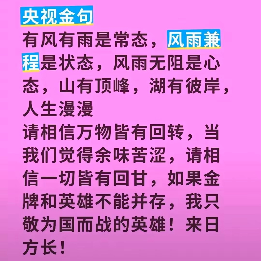 楚钦和莎莎:虽没能如愿获得全运会金牌,但想把央妈说过的话送给你俩:有风有雨是常态,风雨兼程是状态,风雨无阻是心态。山有顶峰,湖有彼岸,人生漫漫,请相信万物皆有回转。如果金牌和英雄不能并存,我只敬为国而战的英雄!