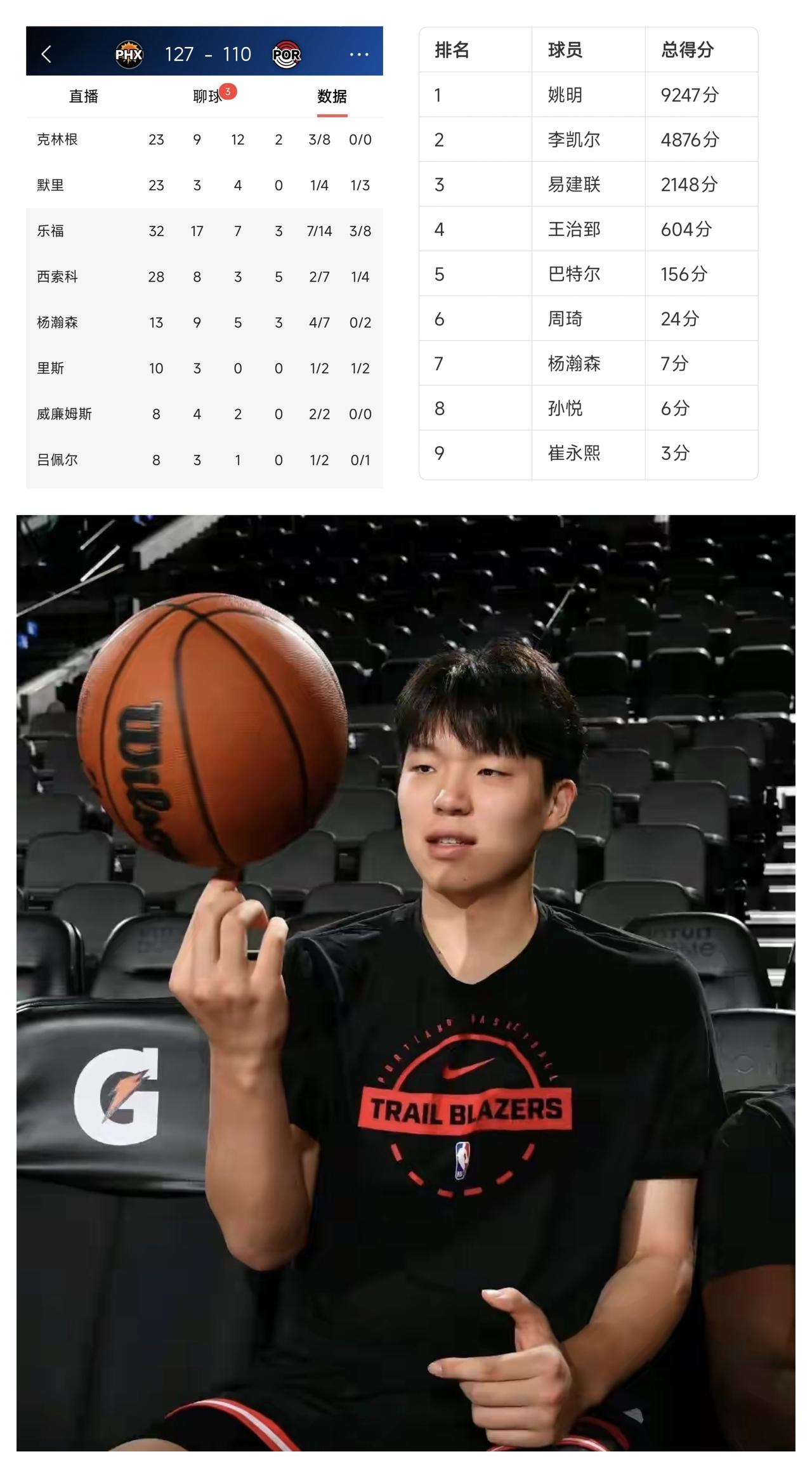 ✨杨瀚森NBA常规赛得分创新高✨ 🐼 随着杨瀚森在发展联盟的表现,首场8分13篮板4助攻,第二场爆砍21+9+3。人们意识到,开拓者队有些低估杨瀚森了。今天在开拓者对阵太阳队的比赛中,杨瀚森出场13分钟,得9分5篮板3助攻。创造了NBA的新高。 🐼 今天是杨瀚森在NBA常规赛第6次出场。效率已经超过里斯和罗威,克林根今天出场26分钟,也是得9分。杨瀚森的进攻潜力是开拓者队中锋里最好的。开拓者队应该围绕小杨设计一些战术。 🐼 贫道早就指出,开拓者队现在打5小阵容的弊端是很容易出现大规模伤病。大家都受伤了,杨瀚森自然有上场时间了,只是小杨尽量自己别受伤,要机灵一点。杨瀚森现在NBA常规赛累计得到16分,距离周琦的24分还差8分。再打一场就能超越了。 ——加油!杨瀚森,用你的表现打脸那些哔哔叨叨,说你是另外一个河升镇的,网黑子们。 作者:龙须面🧐