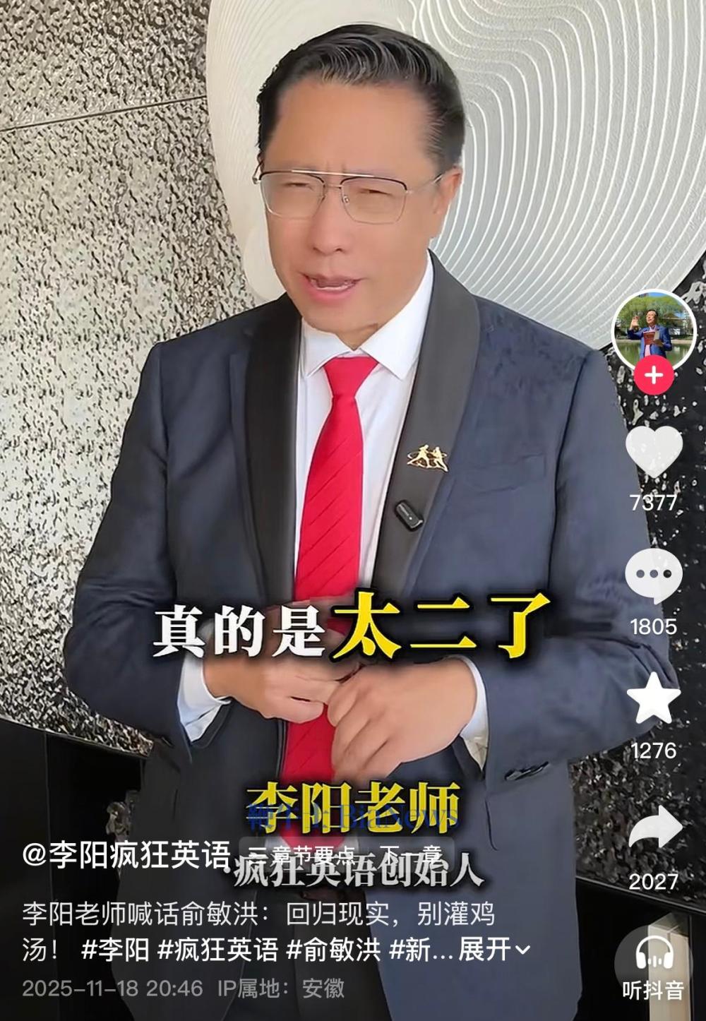 李阳在视频中直言,“俞敏洪老师真是太‘二’了,应该放下自大的形象,不要老灌输心灵鸡汤,不如一句鸡汤给员工100块钱”。