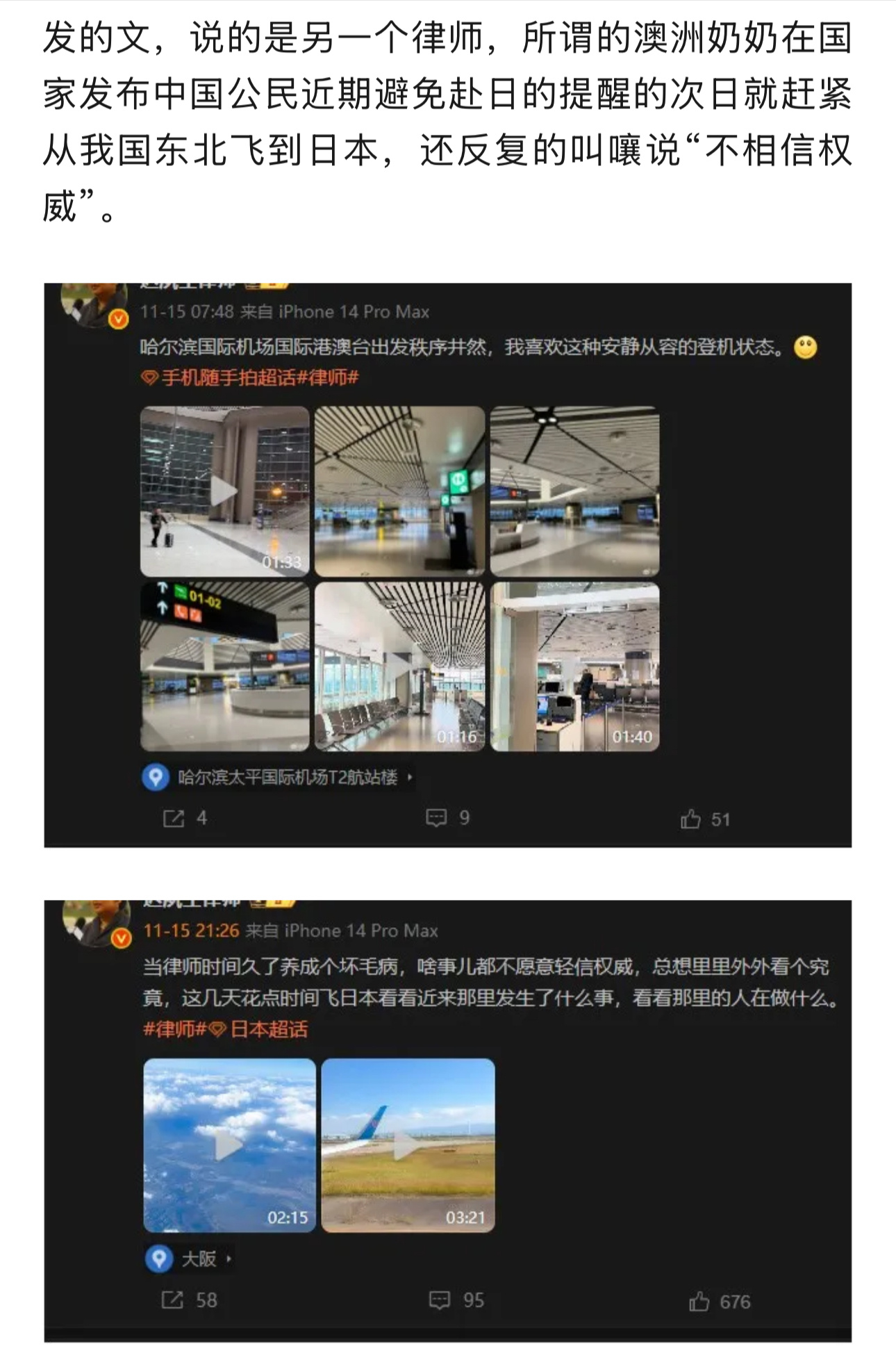 明明是出现大量前往日本的机票被退订,有个别律师不但在国家发布中国公民近期避免赴日的提醒的次日就赶紧从我国东北飞到日本,还反复的叫嚷说“不相信权威”。还在网上找到一张有可能是去日本的照片转发阴阳怪气的说“年轻人居多”是何居心,大家都应该知道