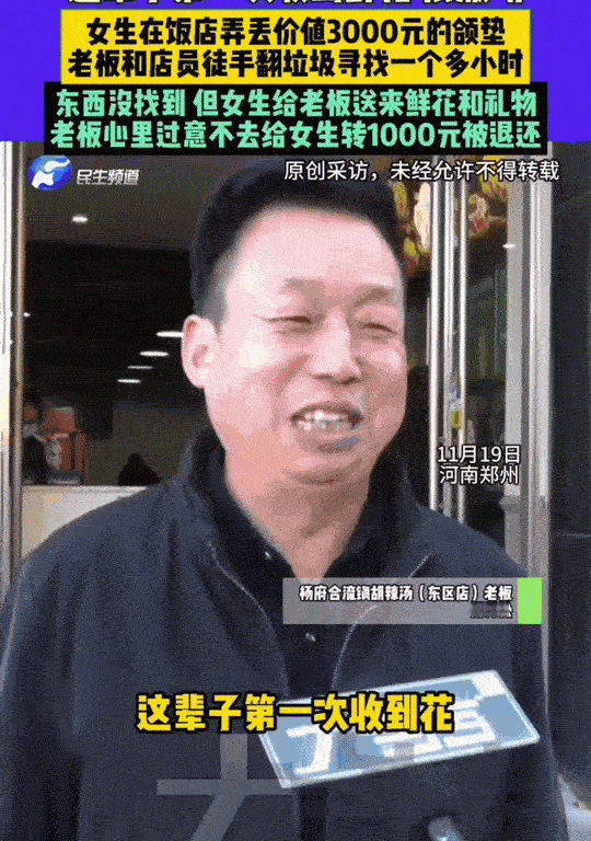 看感动了!河南郑州,年轻女孩吃饭的时候,弄丢了3000元的颌垫。餐馆老板翻垃圾寻找,虽然没有找到,女孩还是带着礼品来感谢。 年轻女孩征征在杨先生的餐馆吃饭的时候,不小心弄丢了颌垫(矫正牙齿用的)。杨先生知道后,带领员工一起翻垃圾寻找。因为颌垫价值3000元,年轻女孩也是刚工作不久,所以杨先生希望能够帮她找到。 他们徒手翻找厨余垃圾,女孩征征一直觉得不好意思。一直跟老板说,别找了,别找了。因为垃圾确实味道太刺鼻了,看着年纪和自己父亲差不多大的老板,在帮助自己找东西。女孩感动的哭了。 找了一个多小时,虽然最后没有找到,但是女孩非常感谢老板和他的员工。女孩为了表达感谢,特意买了一束鲜花,还买了茶叶和饮料。老板杨先生也非常感动和高兴,他说,这还是自己第一次收到鲜花。 但是,他同时觉得不好意思,没有帮女孩找到东西,女孩还买了这么多礼品。女孩本来就刚工作不久,也没有什么收入。他就转给了女孩1000元钱。女孩无论如何也不肯收。 这个场景太让人感动了。年轻女孩有一颗感恩的心,杨先生也能体谅女孩的不容易,一直为女孩着想。他们都是善良的人。这是有了这些善良的人,我们的社会更和谐,更美好。