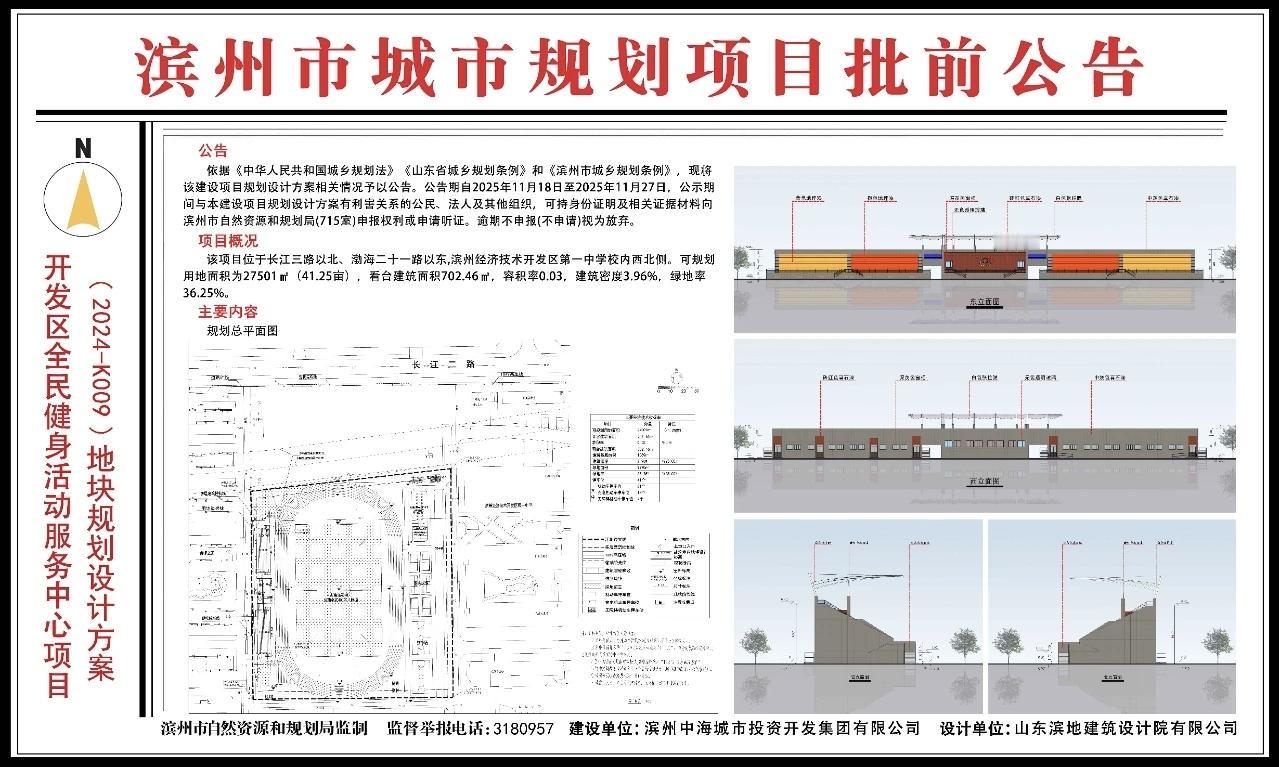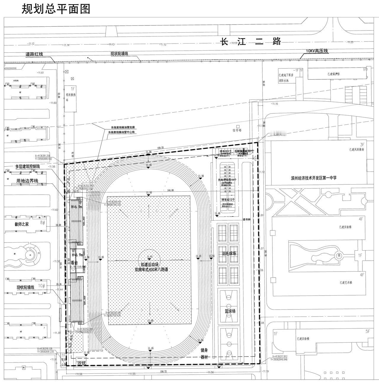 滨州开发区“全民健身中心”方案来了 11月18日,山东省滨州市自然资源和规划局公布《开发区全民健身活动服务中心项目(2024-K009)地块规划设计方案》:(图一) 该项目位于长江三路以北、渤海二十一路以东,滨州经济技术开发区第一中学校内西北侧。可规划用地面积为27501m(41.25亩),看台建筑面积702.46m,容积率0.03,建筑密度3.96%,绿地率36.25%。 放大规划图片可清晰看到:拟建运动场双曲率式400米八跑道,东侧有篮球场和羽毛球若干,设置停车场(含充电)。该项目虽位于校内,但冠以“全民健身”之名。后期建成后是否对外开放目前却没有明确信息。 前段时间,有市民反映:滨州西区没有体育公园,没有篮球场,每次健身都要跑好远去全民健身广场,或者去北海南码头体育公园,或者新立河公园,请问滨州开发区是不鼓励该地区的人民健身吗?咱们开发区这边新小区越来越多,能不能建个体育公园啥的...... 滨州经济技术开发区回复:经核查,滨州经济技术开发区已有中海健身广场(黄河五路、渤海十九路)、秦皇河湿地公园东岸(长江四路、渤海十九路)等场地,配备了篮球场、足球场等多种健身设施,可满足周边群众基础健身需求,可就近使用.... 来源 综合滨州市自然资源和规划局
