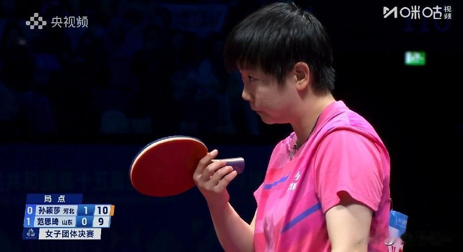 正在直播 全运会乒乓女团决赛 河北队暂时1-1山东队 第一盘:何卓佳/王添艺0-3不敌王晓彤/陈梦【8-11,7-11,5-11】 第二盘:孙颖莎3-0范思琪 第一局,孙颖莎以11-5先下一城,大比分1-0领先。 第二局,孙颖莎以11-9再下一城,大比分2-0领先。 第三局,范思琪以12-10扳回一局,大比分来到1-2。 第四局,孙颖莎火力全开,以11-5锁定胜局,总比分3-1帮助河北队扳回一城。 第三盘:王添艺vs陈梦正在进行~