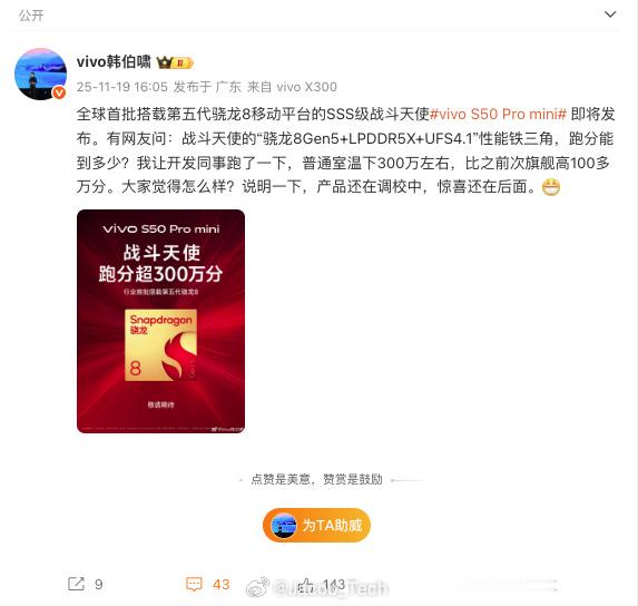 顶天了是吧...这次蓝厂真的不是跟我们开玩笑的?vivo S50 Pro mini直接给到了骁龙8Gen5,跑分很粗暴直接去到了300万左右,还是普通温室...我的天,越级战斗天使是吧