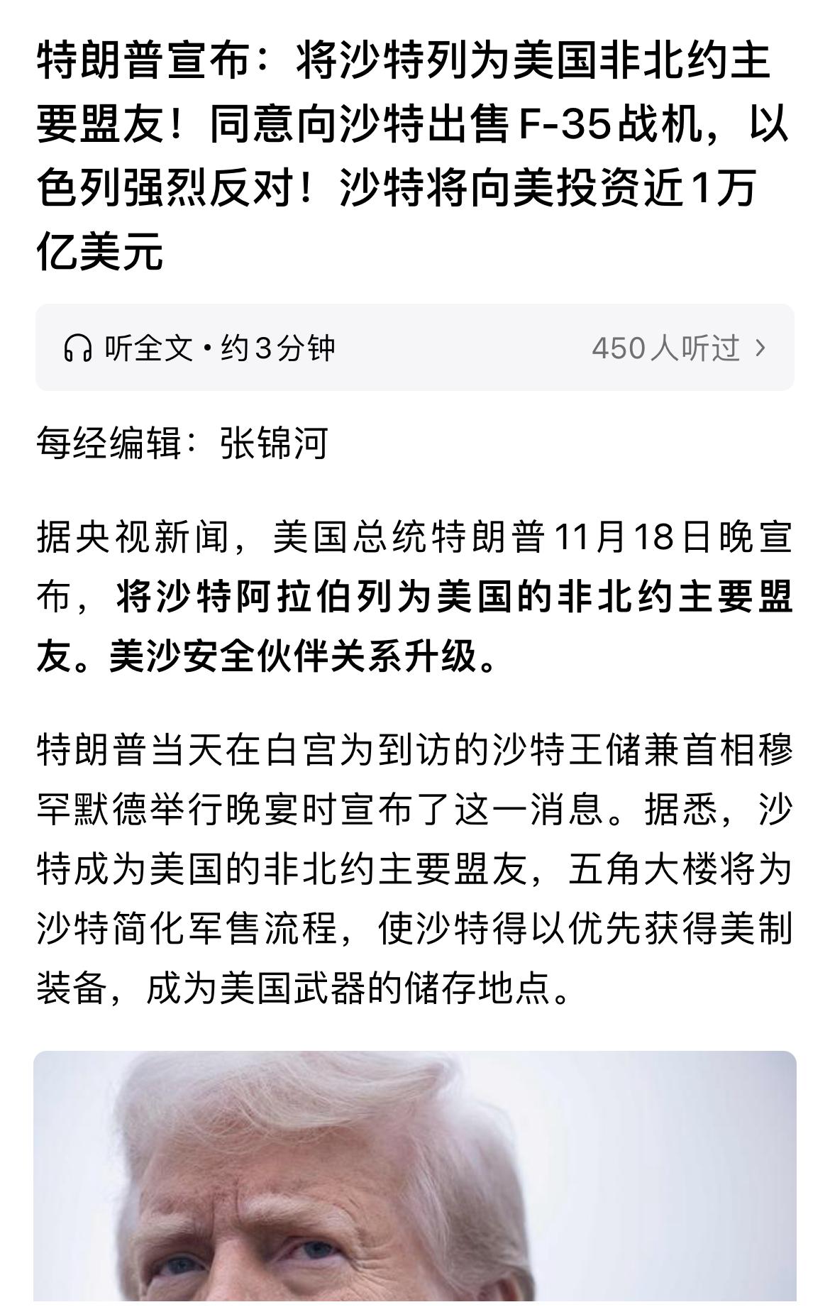 特朗普和以色列又在演戏了,美国向沙特出售F-35战机,以色列强烈反对?这根本就不是实情,以色列是美国盟友中的盟友,绝不会动摇,而沙特实际上还很想和以色列建交,沙特为了表忠心,又承诺向美投资近1万亿美元,中东的形势急转是从叙利亚政权更替开始的,太可惜了。