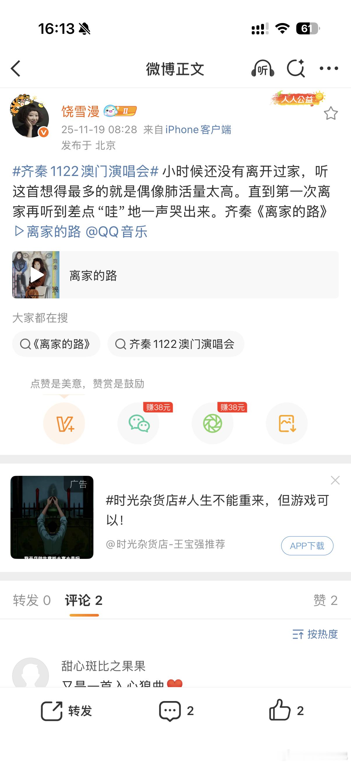 饶雪漫追星太成功了!和齐秦10年兄妹情,是粉丝与偶像的佳话。齐秦1122澳门开唱,她发一天相关,让情怀与热度齐飞!