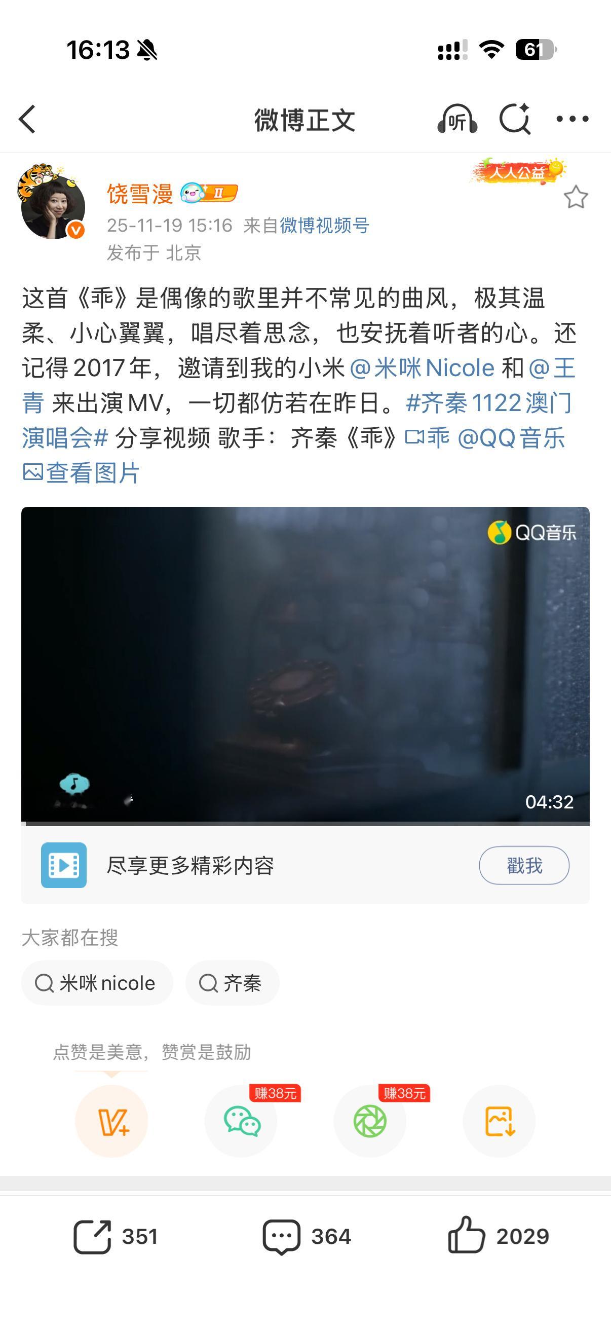 饶雪漫追齐秦超上头,连发动态安利还cue《大约在冬季2019》,说歌曲超戳心,安利满是真情实感,沉浸式追偶像的样子,活脱脱头号迷妹,像极了我们为喜欢的人疯狂打call、按头安利的模样。